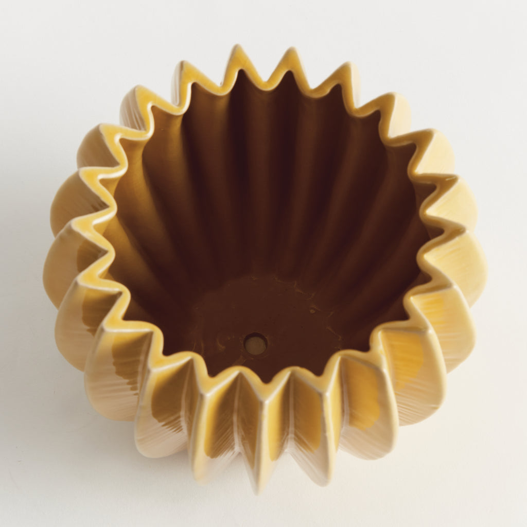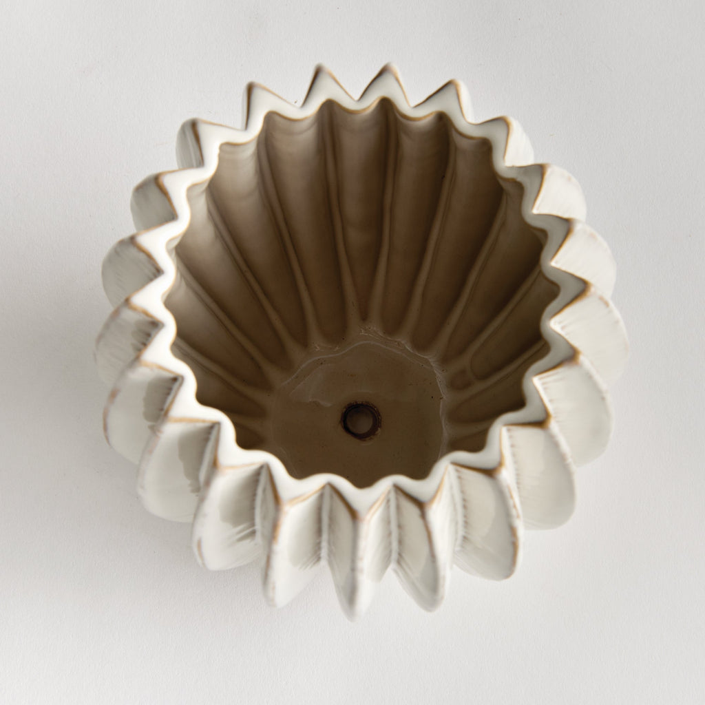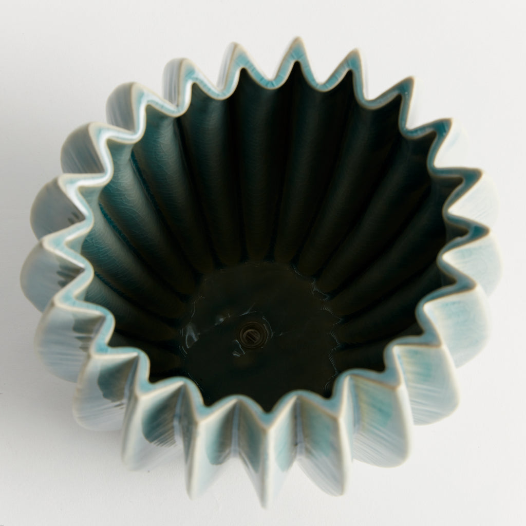 With a rounded form, deep ribbing and thickly applied glaze, this nature-inspired pot is a work of art. The hand-finished details give it an artisan's touch. Add a lush green plant or delicate orchid and enjoy. Simply gorgeous.