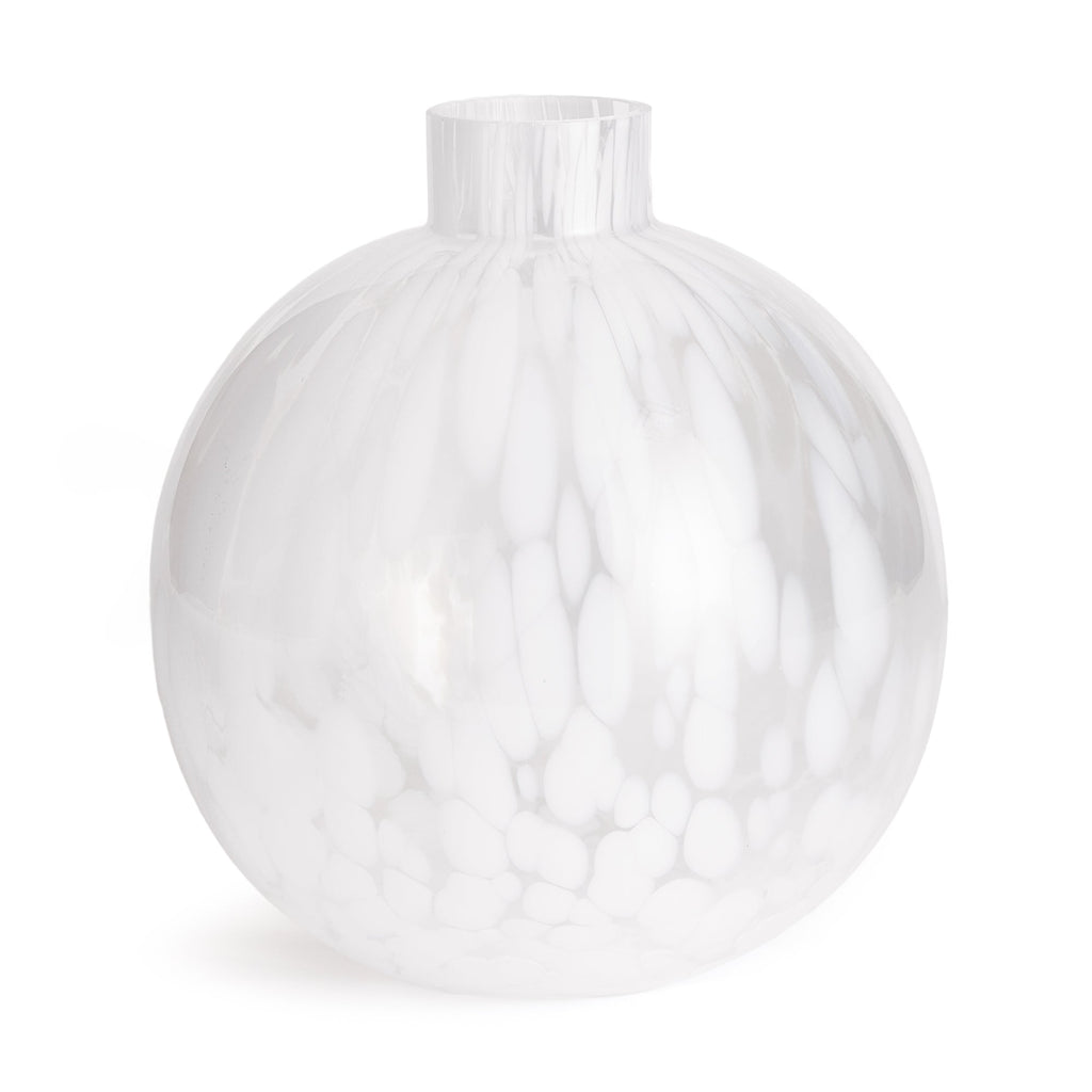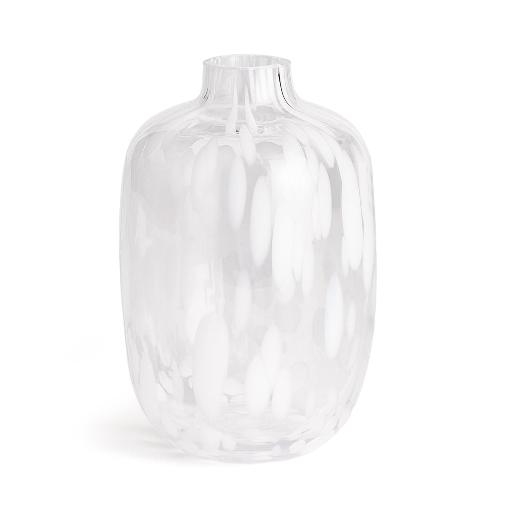 Glass blown, with milk glass beads melted in slowly to create a gorgeous spotted pattern, this vase is a truly one of a kind piece. An exquisite accent for side table, mantel or bookshelf.