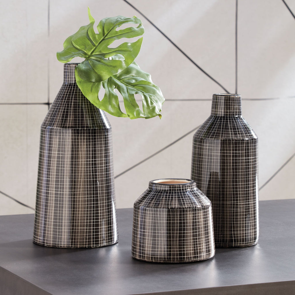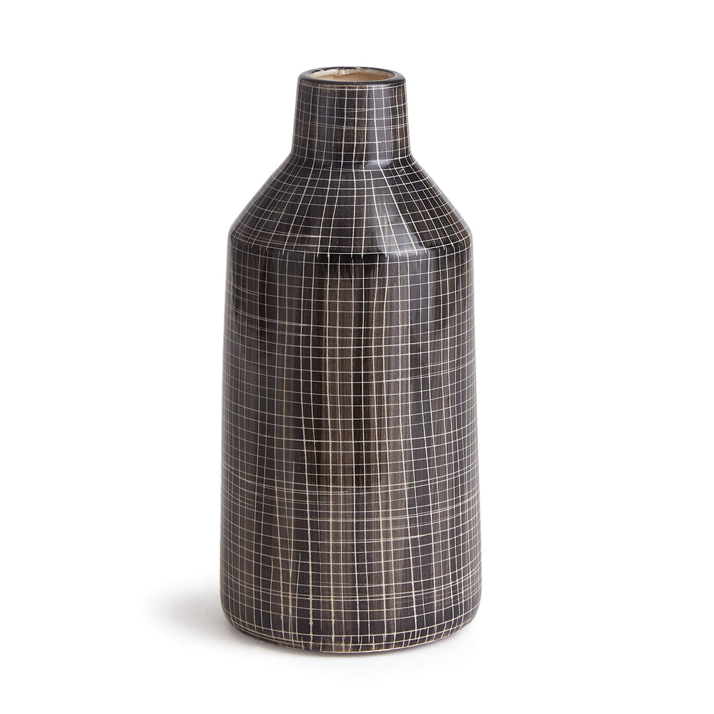 The Idzi Bottle Vase is a stunning piece of craftsmanship, featuring a graphic and sophisticated cross-hatching of black and white. Perfect for faux florals, it also stands out beautifully on its own.