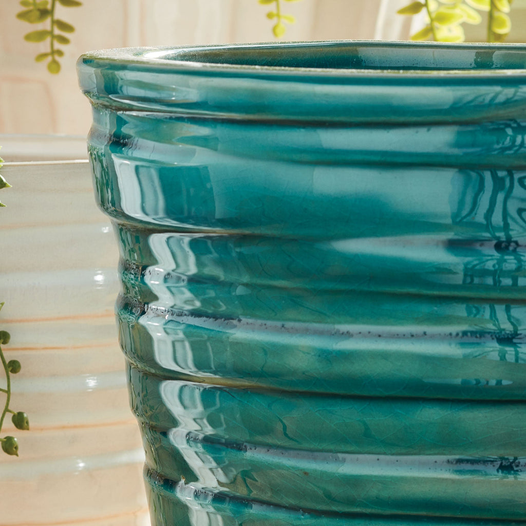 The Tansey Pots are a unique set that appear as if they were turned on a potter's wheel. Handcrafted by skilled artisans, each piece is an original and varies in size and color. Made from ceramic, these pots are available in Jade Blue and White. They feature drain holes for easy plant care. The sizes are 11 x 11 x 9 inches and 8 x 8 x 7 inches. Dust with a dry cloth and protect fine furniture by lining the interior of the pottery when necessary. Fill with your favorite houseplant and watch them grow.