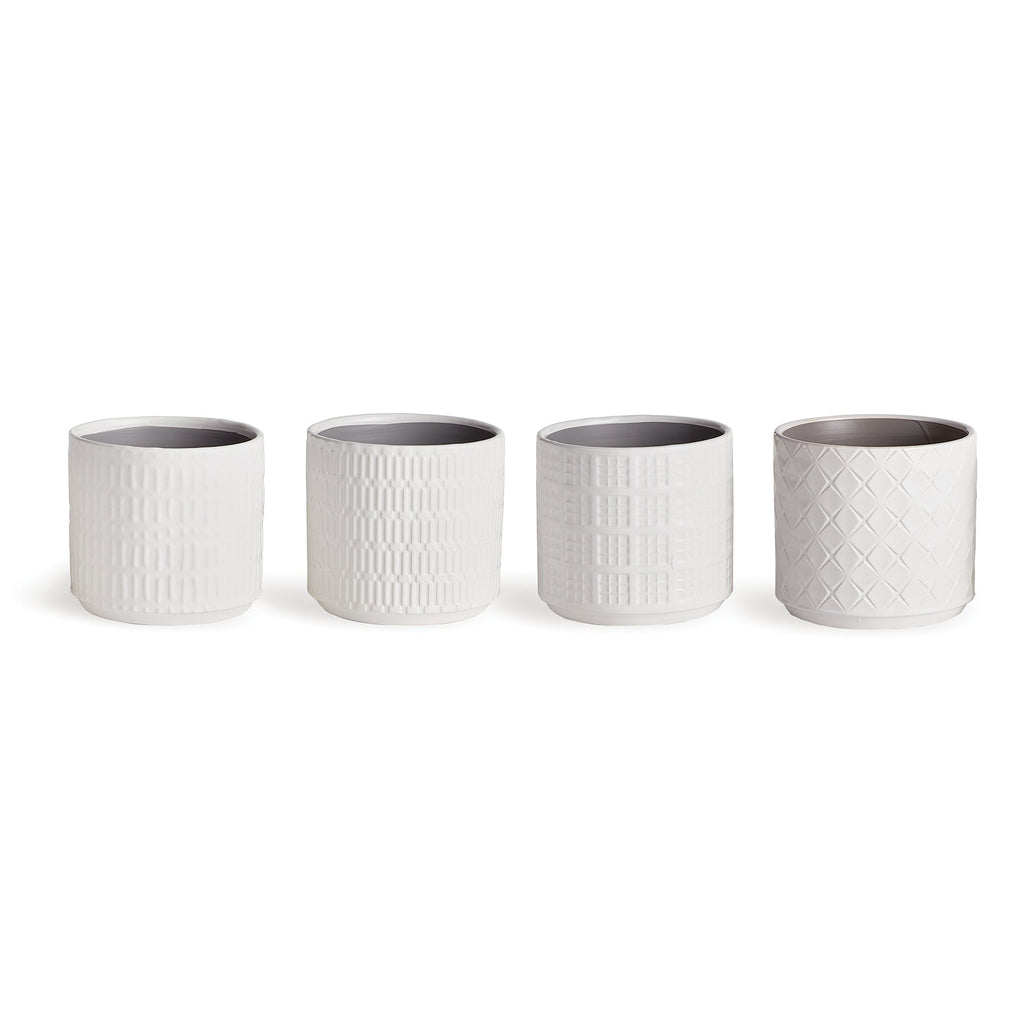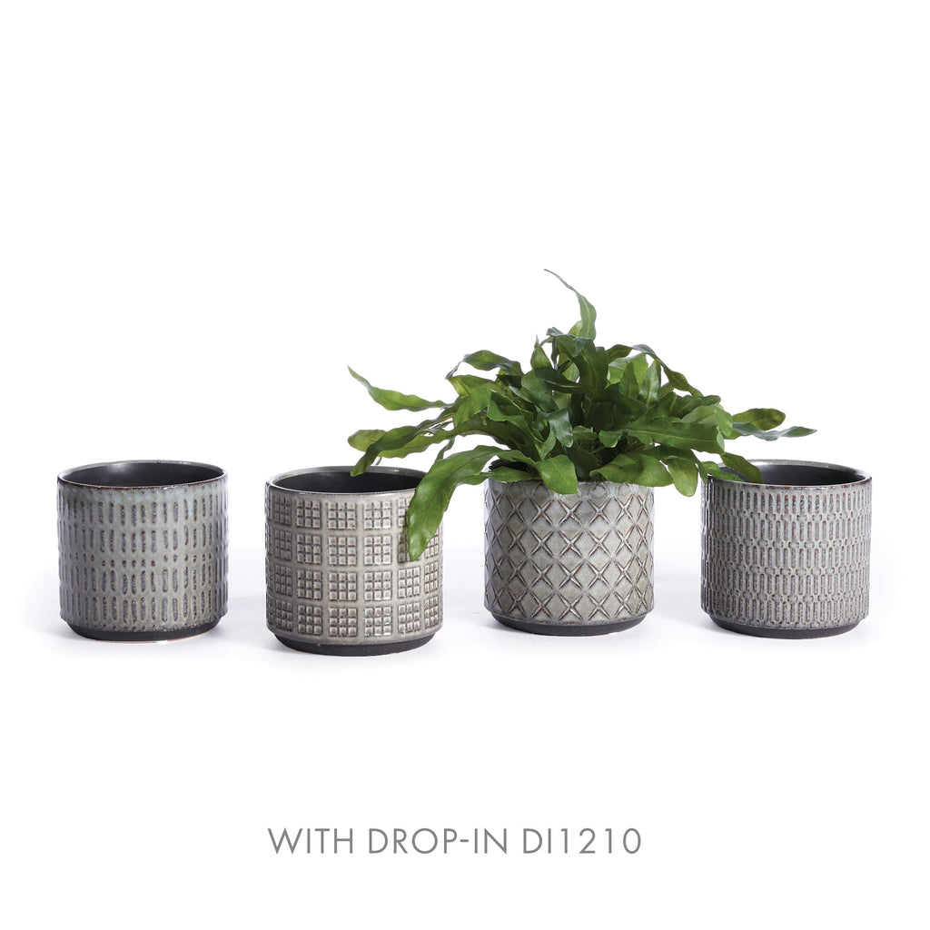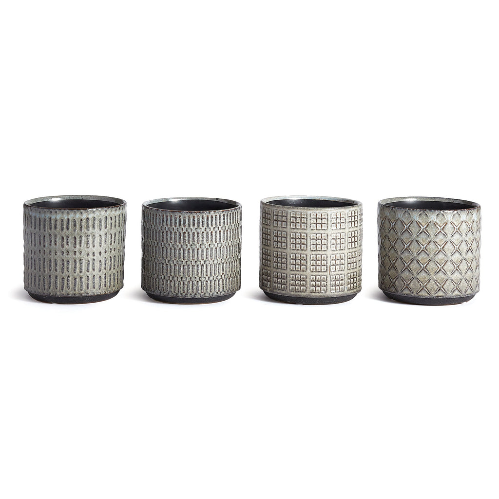 This set of pots in playful geometric patterns are fun to mix and match. Available in three muted colors, all in a high gloss glaze. A fashion statement for your plants.