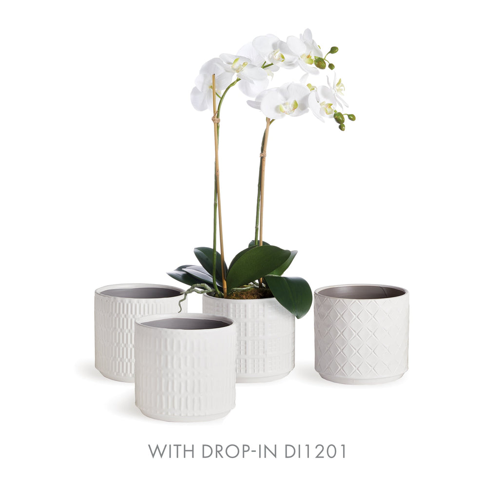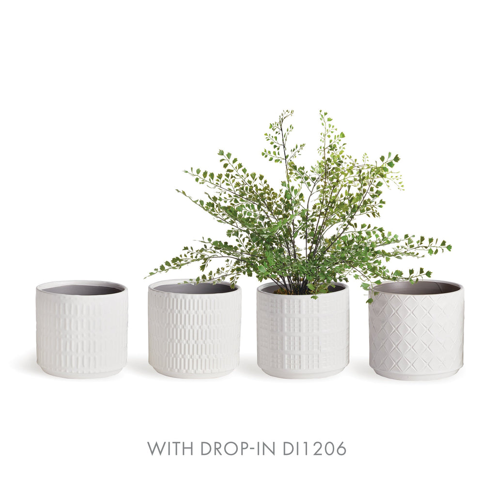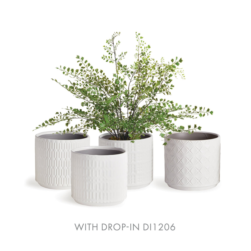 This set of pots in playful geometric patterns are fun to mix and match. Available in three muted colors, all in a high gloss glaze. A fashion statement for your plants.