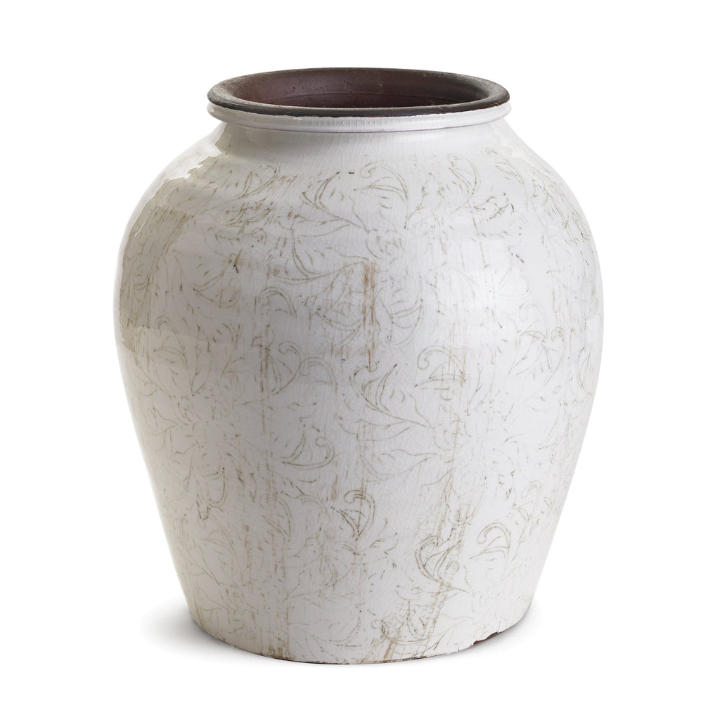 A subtle floral scrollwork adorns this classic urn, adding a lovely, feminine touch. The finish is a high gloss crackle glaze. The beauty truly is in the details.