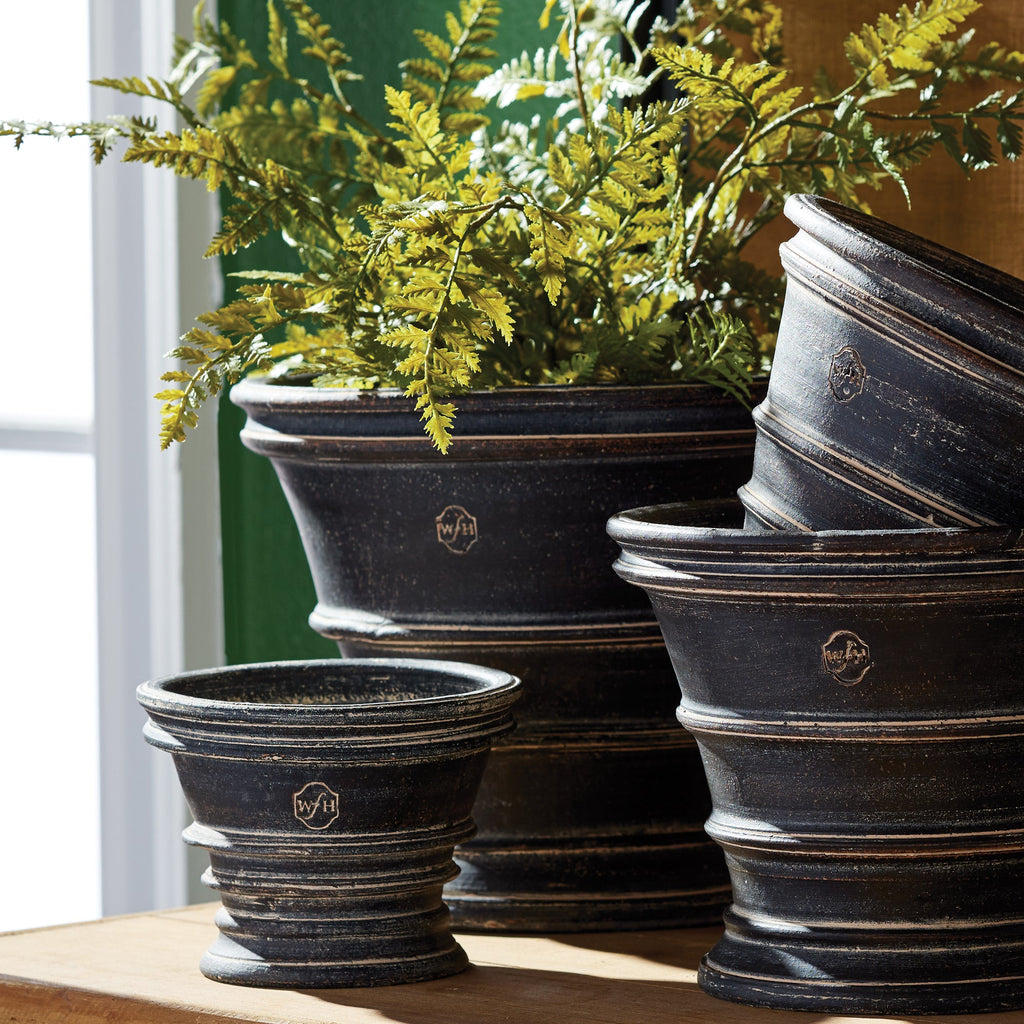 Use as cachepot or plant directly into. Protect fine furniture by lining the interior of the pot. Protect from frost and hard freeze.