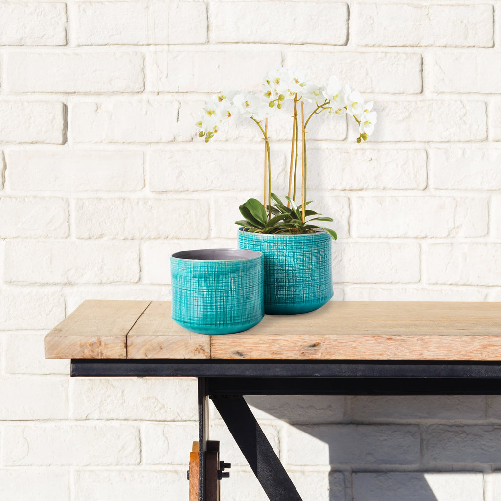 With an organic shape and textile-inspired crosshatching pattern, the Serge pots are a fashionable set. A high gloss finish and deep rich glaze are a great compliment to ferns, flowers, or succulents.