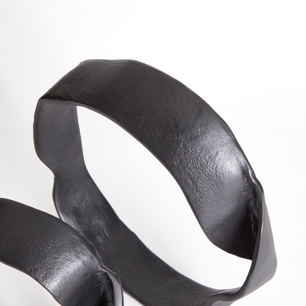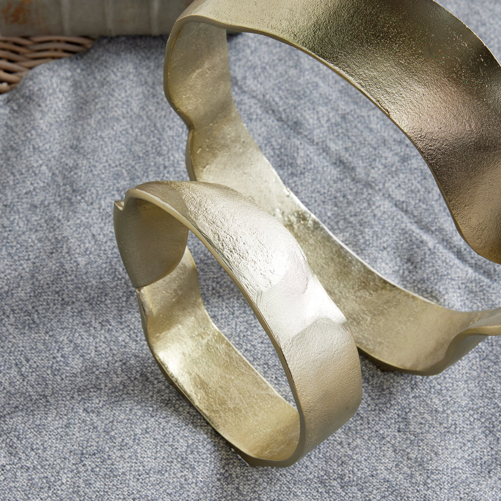 A unique pair of cast aluminum sculptures with contemporary sculptural shapes. Available in a textured champagne gold or matte black finish, these pieces add a modern touch to home offices or dens, whether placed on a bookshelf or styled in a tray on an ottoman.