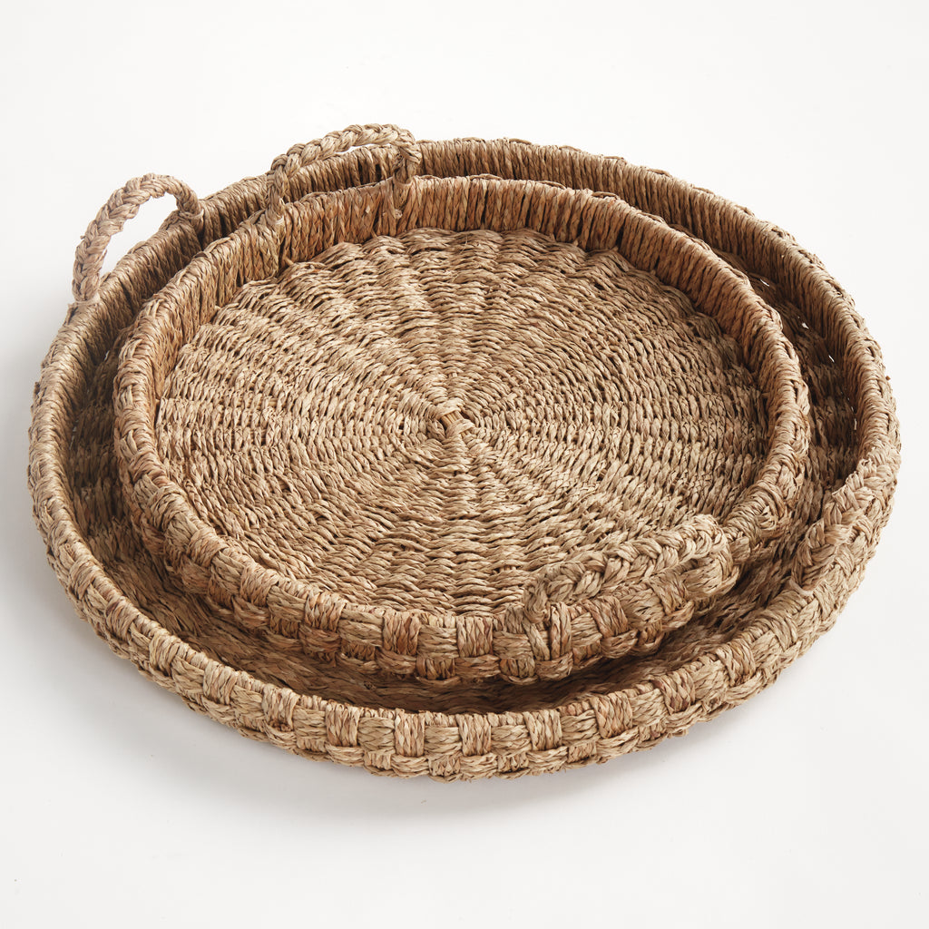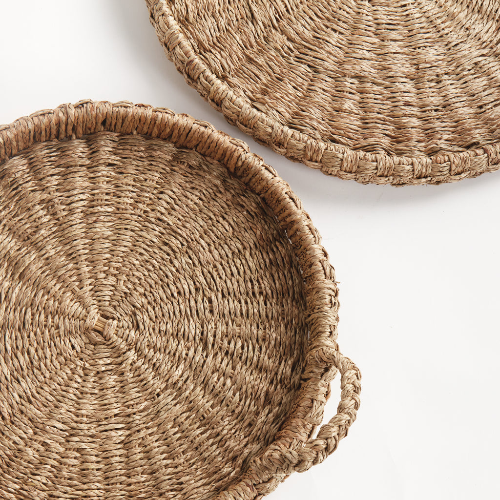 This set of 2 round trays with handles is light in tone, with a signature Mendong weave. Abundantly grown and sustainably harvested, it is stiff and rigid, with a wire framework. Perfect for serving drinks, or just to display your special books or accents.
