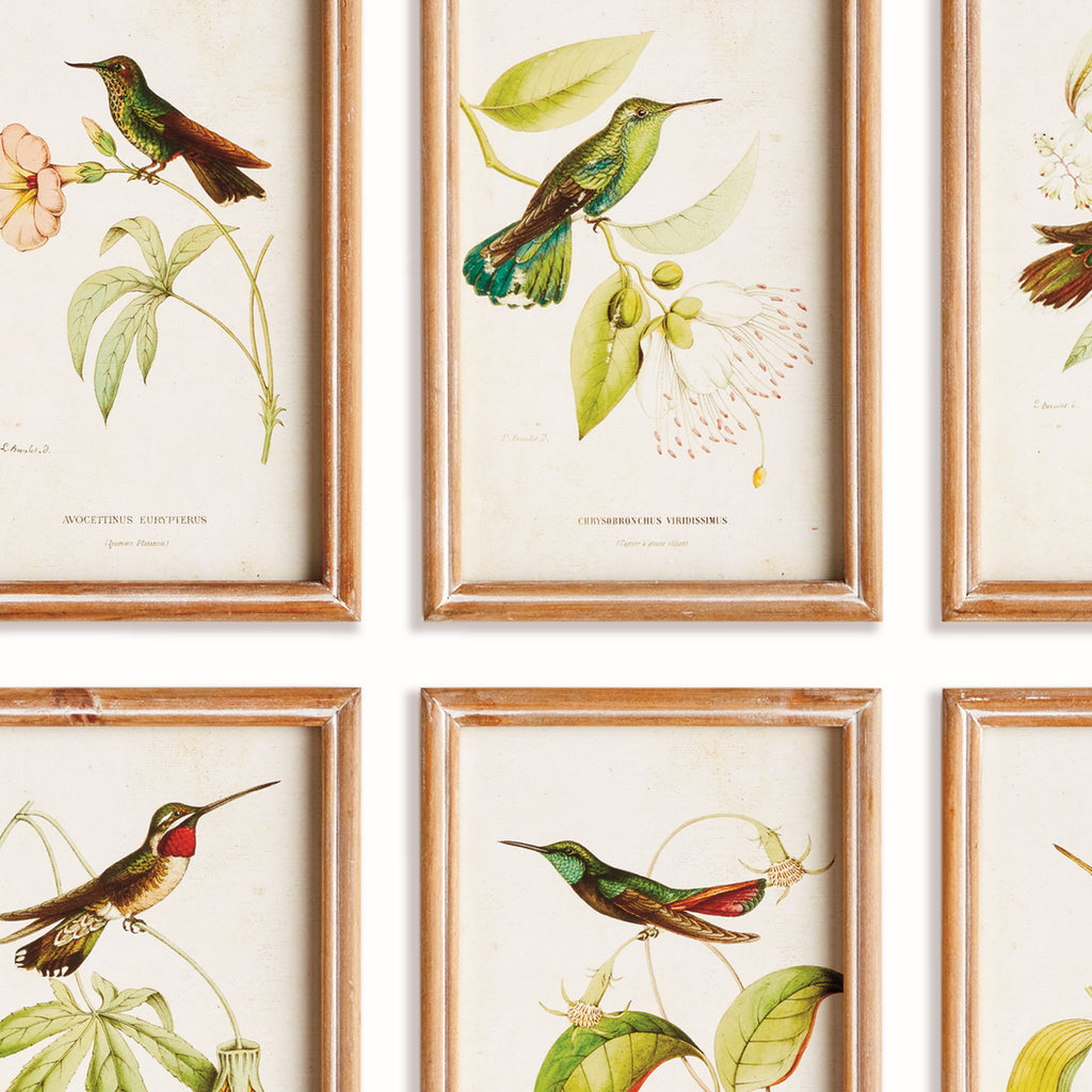 Incredibly intricate, yet whimsical in style, these cheerful hummingbird prints are a traditional set. This set of 8 is utterly versatile, hang all together, or separate into vignettes for the smaller space. Finished off in a fir wood frame, a great way to dress your walls in classic style.