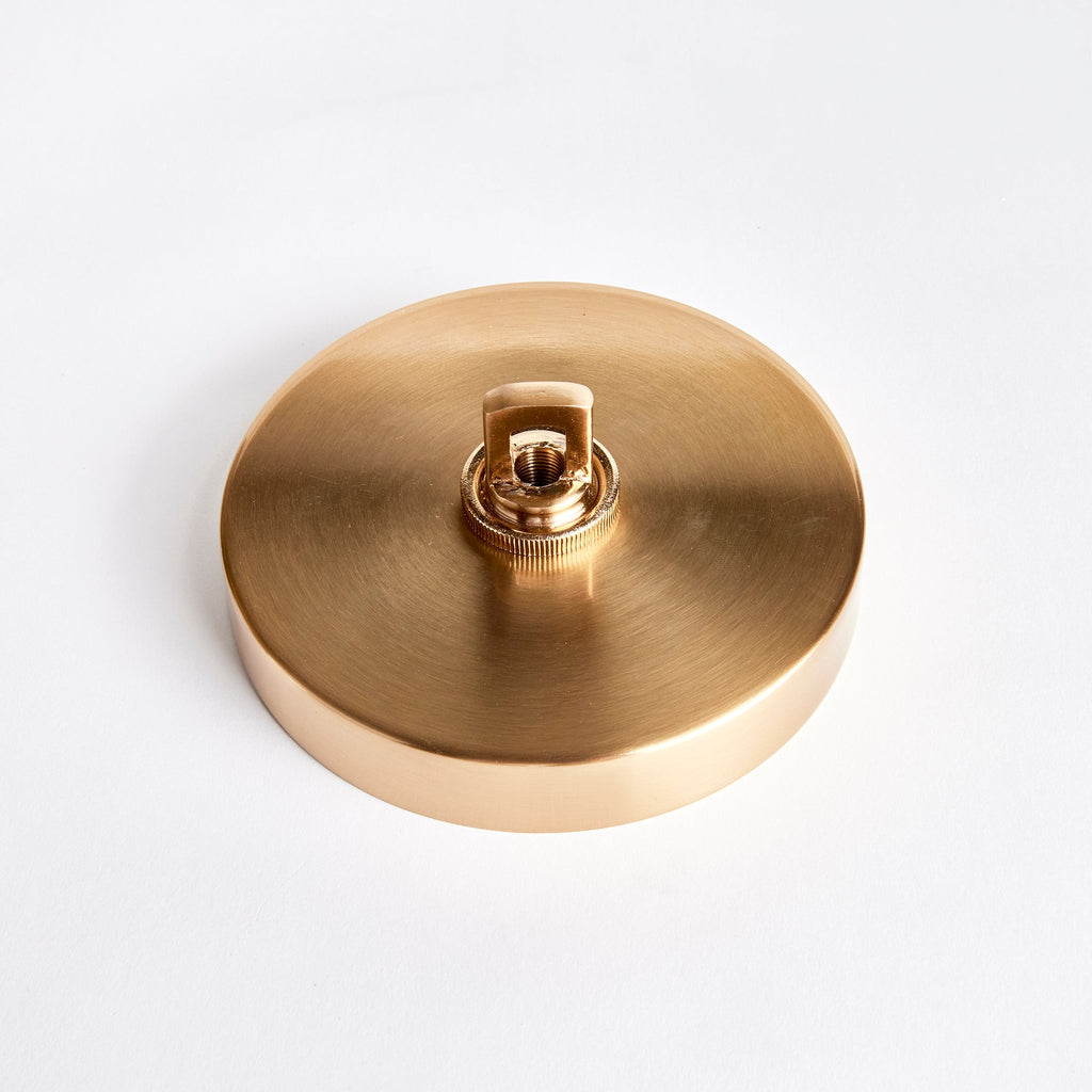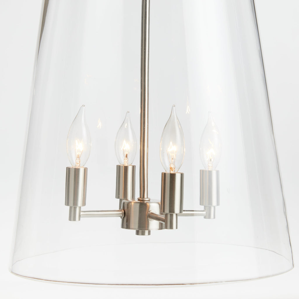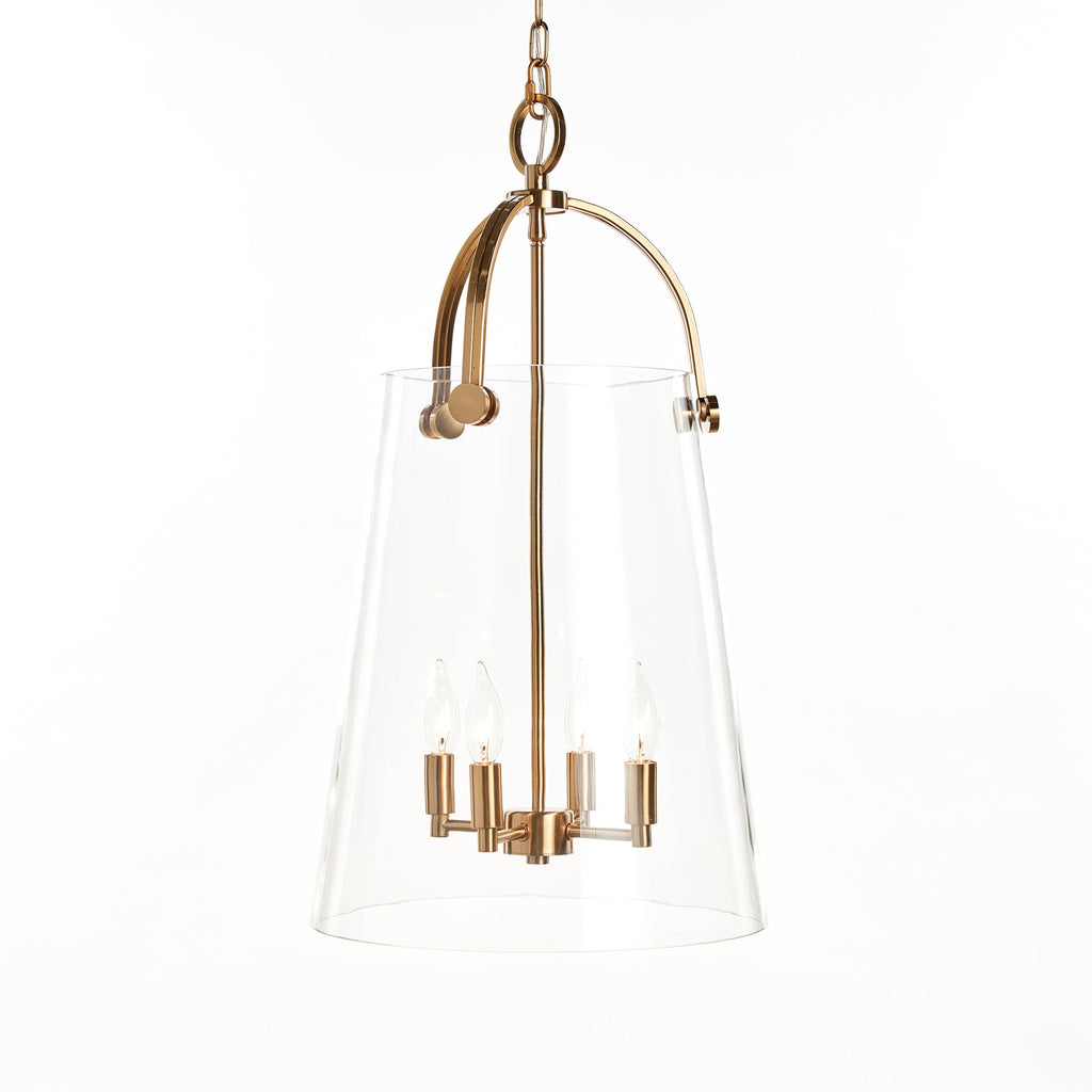Made of a custom glass mold, this pendant is well-proportioned. In a clever design decision, the top metal detail goes through the glass, creating a unique look.