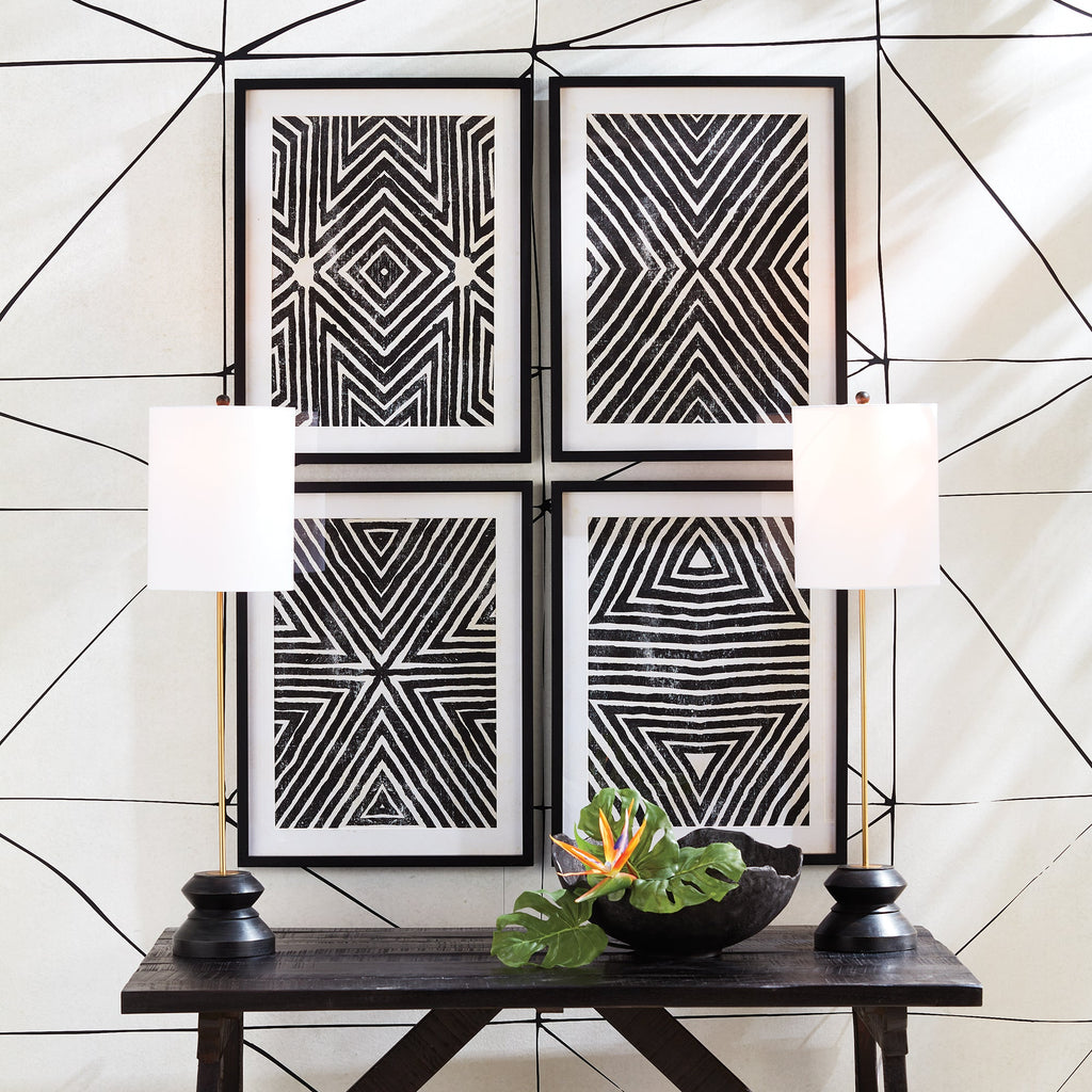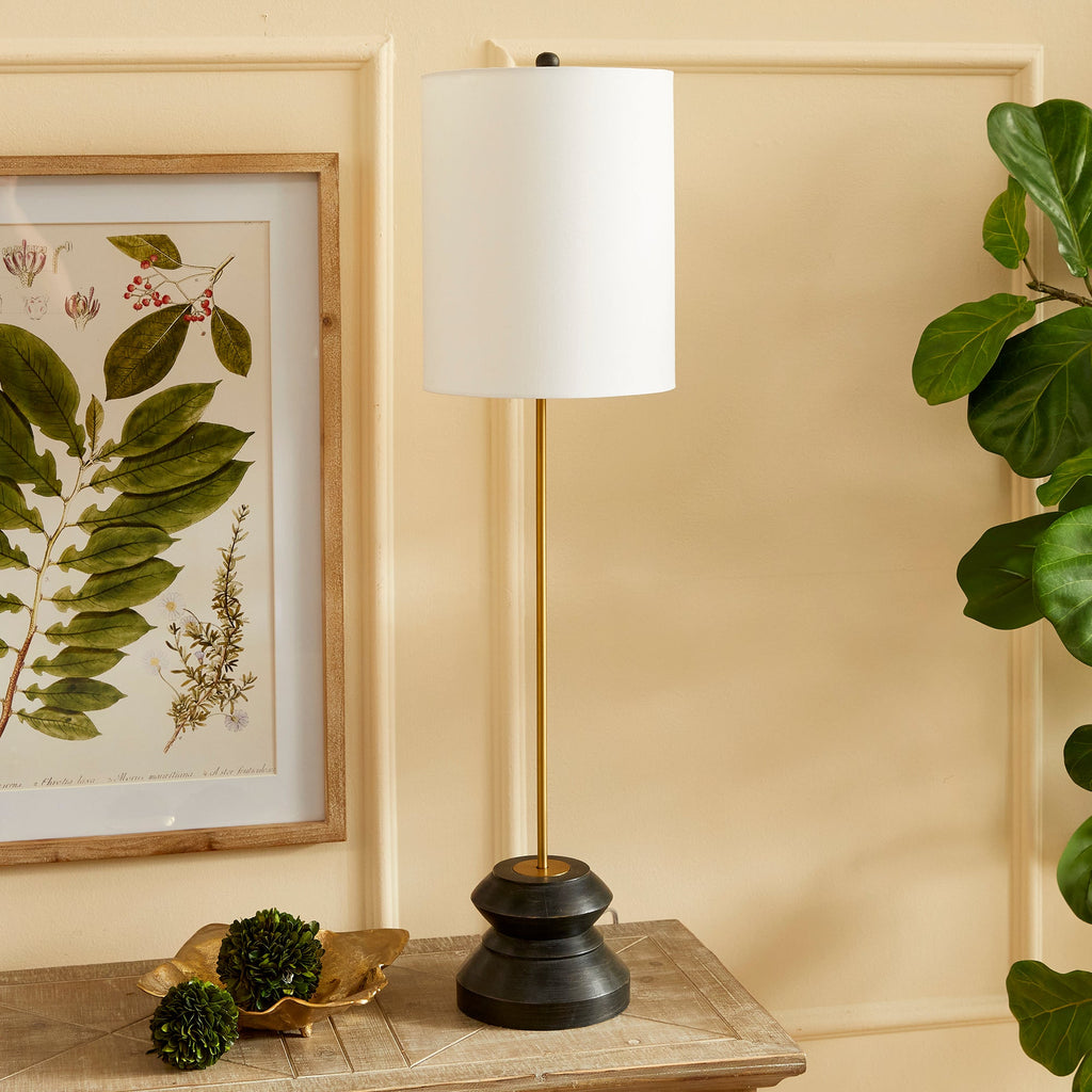 The lamp features a tall, narrow profile with a geometric turned wood base, available in different finishes. Perfect for flanking both sides of a long console or entry table, it is a simple and streamlined way to light up the room.