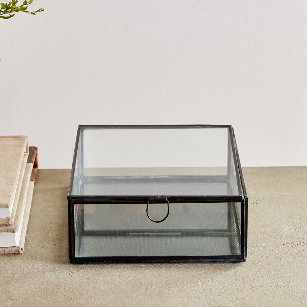 Simple and tailored, this glass and brass box is designed to hold your most treasured mementos. A brass mesh layer adds a unique and handsome detail to the bottom.