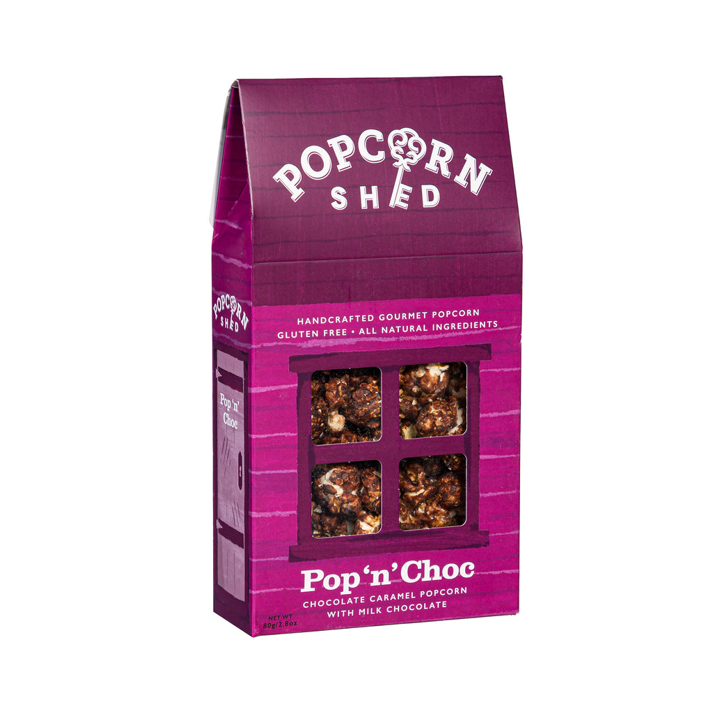 Indulge in the rich taste of Popcorn Shed's Pop N' Choc, a gourmet treat featuring chocolate caramel popcorn with milk chocolate. This 80g pack offers a delightful snacking experience that's perfect for gifting.