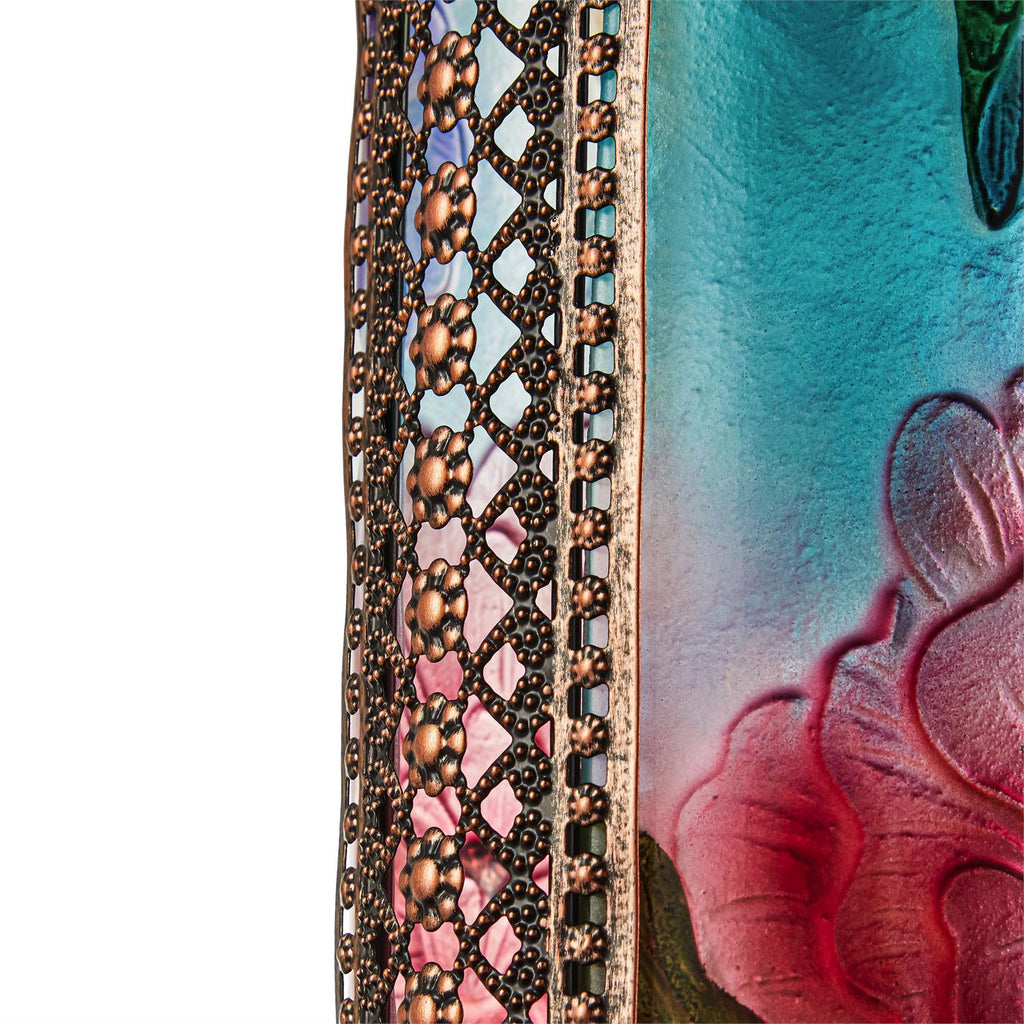• Colorful stained glass design with hummingbirds