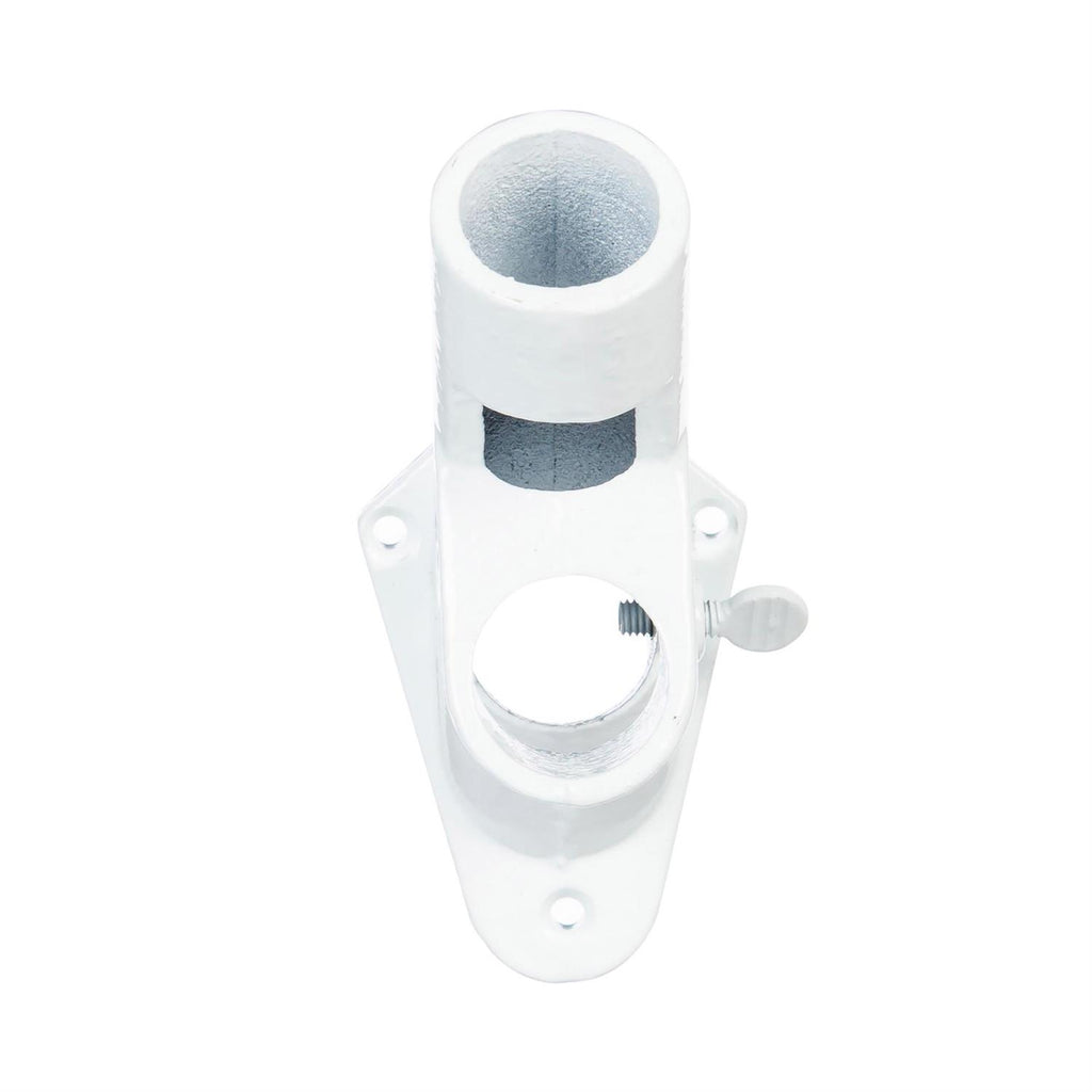 Easy to install, you can fly your flag wherever you'd like with the help of this adjustable pole bracket. Crafted from aluminum with an white finish, the two-position bracket, formed by casting, can be used as a wall mount or pole for house and estate flags. Choose between two different positions: 45-degree angle or 90-degree angle. Mounting screws are included. The hardware is powder-coated with a weather-resistant finish to ensure long-lasting use.
