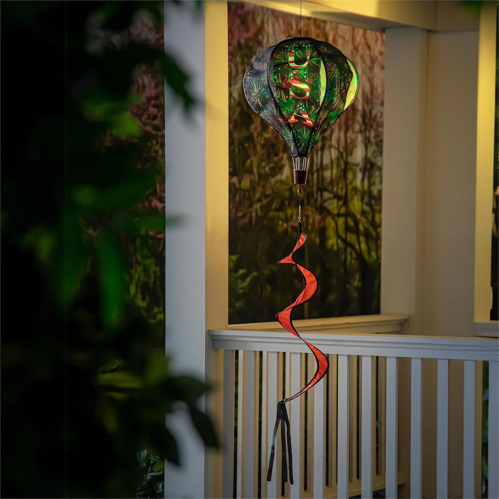 Get creative in showcasing your American pride with this God Bless the USA Lit Burlap Balloon Spinner. This decorative accent comes to life in more ways than one as it twirls at the touch of a breeze and then begins to glow as day turns to night. Featuring USA in red, white, and blue against a background of fireworks for a patriotic display, the spinner takes on the unique form of a hot air balloon, making it the perfect eye-catching decorative accent. Designed to easily hang in your garden or on your patio or porch. At dusk, watch as the design turns on and changes colors! Allow the spinner to get at least 6 hours of direct sunlight for a full charge. To use, turn the on/off switch to the on position before charging in direct sunlight. To extend battery life, turn to the off position when not in use. The perfect decorative accent to get you and your family in the spirit for Independence Day and other patriotic celebrations. A plastic spring mechanism locks into place to secure the design during windy conditi