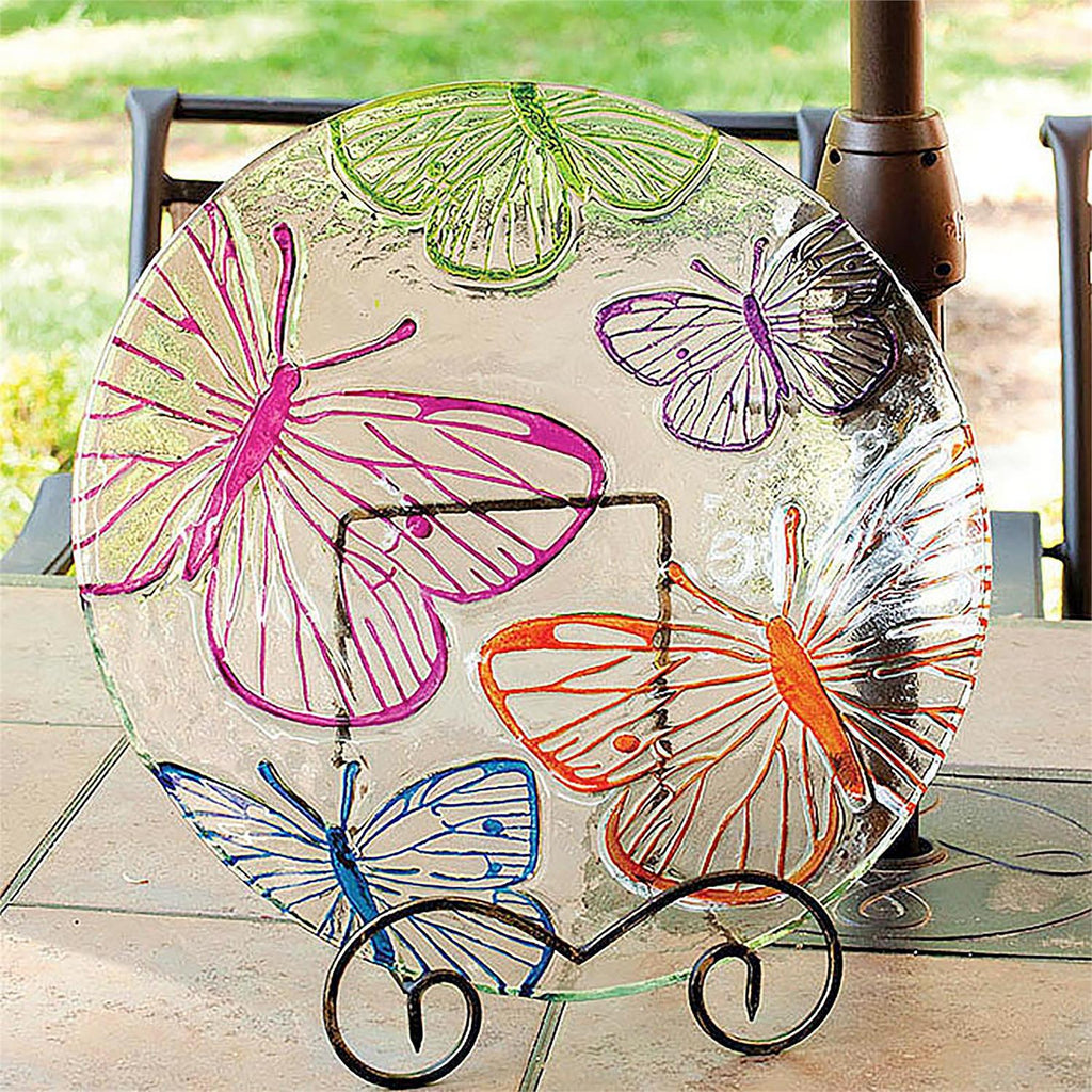 Enhance your garden with this elegant metal easel birdbath, featuring a vibrant butterfly design. Crafted to hold artistic birdbaths securely, its sturdy metal construction ensures stability and durability. The colorful glass plate, adorned with intricate butterfly patterns, adds a whimsical touch to your outdoor space. Perfect for attracting birds while adding a decorative element to your garden, patio, or balcony. Measuring 10 inches in length, 9 inches in width, and 8 inches in height, this birdbath is both functional and stylish, offering a charming focal point for nature lovers.