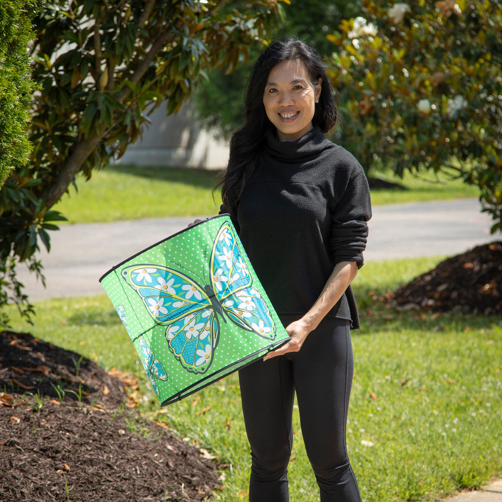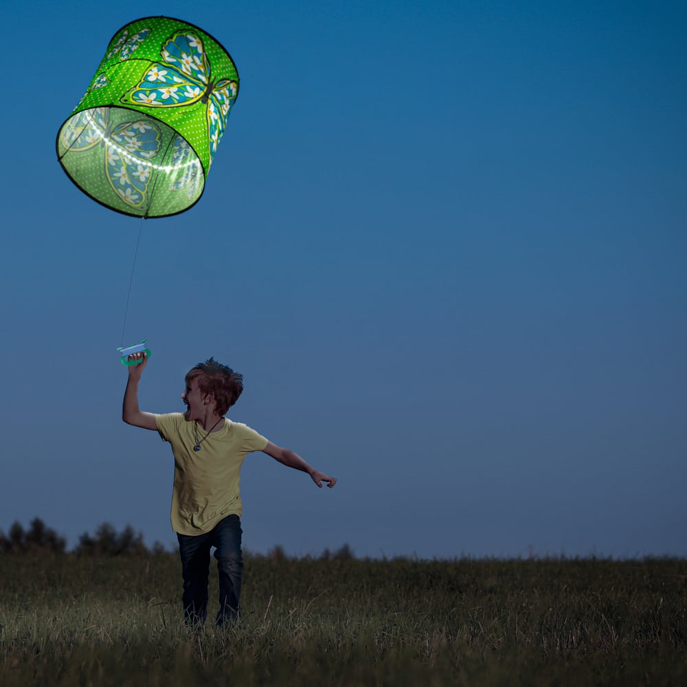 The Ever Fliers LED Floral Butterfly Welcome Collapsible Cylinder Kite combines vibrant floral patterns with LED lights, illuminating the night sky. It's designed for easy use and storage, perfect for both day and night flying.