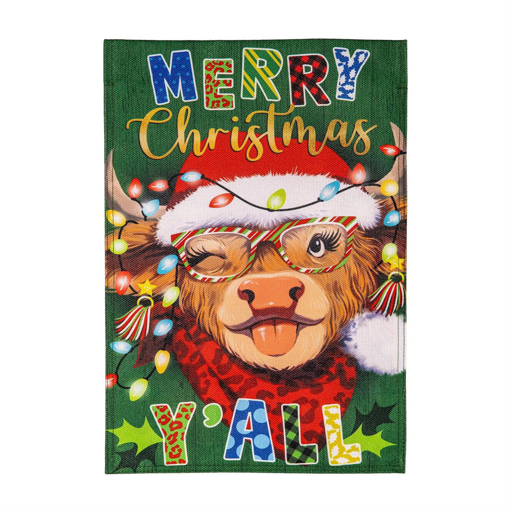 Add a playful touch to your holiday décor with this vibrant and whimsical garden flag. Featuring a cheerful cow in a Santa hat, adorned with festive Christmas lights, this flag is sure to bring smiles and holiday cheer to your outdoor spaces. The bold text "Merry Christmas Y'all" adds a charming Southern twist to your seasonal decorations. Made from durable fabric, this flag is designed to withstand the elements, ensuring your home can celebrate the season in style. Perfect for gardens, porches, or walkways, this flag offers a delightful way to welcome guests during the holidays.