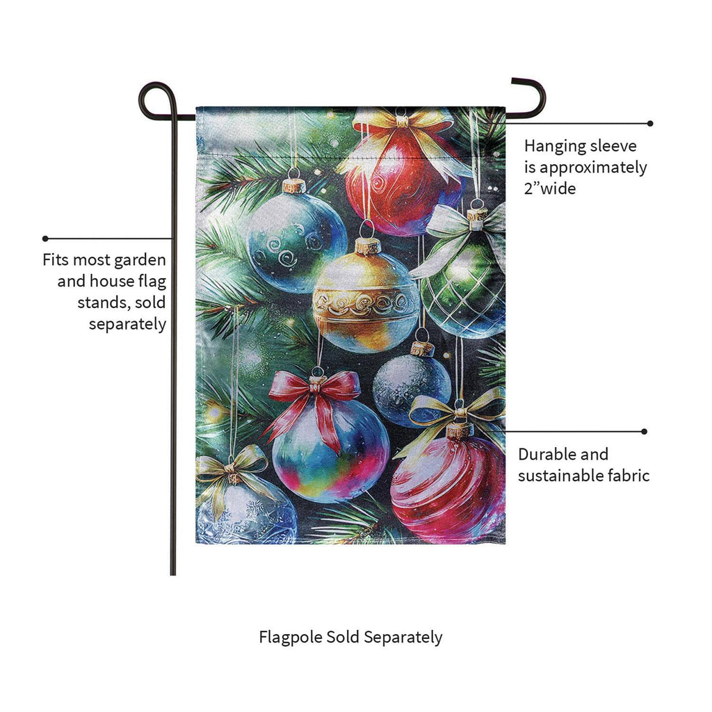 Add a festive touch to your outdoor décor with the Holiday Ornaments Lustre Suede Flag. Measuring 12.5 inches by 18 inches, this vibrant flag features a detailed design of colorful ornaments, perfect for celebrating the holiday season. Crafted from durable lustre suede, it offers a rich texture and eye-catching shine. Its double-sided design ensures that the charming ornament pattern is visible from both sides, enhancing its visual appeal. Ideal for garden, porch, or patio use, this flag brings a cheerful and welcoming ambiance to your home.