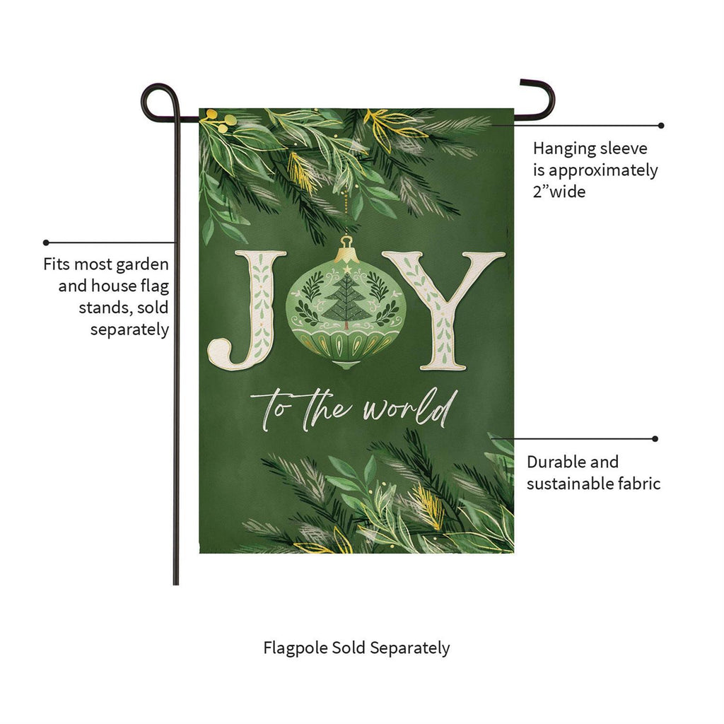 Elevate your holiday décor with the Greenery Joy To The World Suede Garden Flag. This charming flag features a festive green backdrop adorned with lush foliage and a decorative ornament, encapsulating the spirit of the season. Made from durable suede, this flag is designed to withstand the elements, ensuring your garden looks vibrant all winter long. Measuring 12.5 inches in width and 18 inches in height, it's the perfect size to make a statement without overwhelming your outdoor space. Welcome guests with joy and style this holiday season.