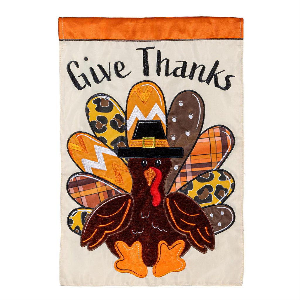 Welcome the festive spirit of Thanksgiving with this charming Give Thanks Patterned Turkey Applique Garden Flag. Measuring 12.5 inches in width and 18 inches in height, this vibrant flag features a delightful turkey adorned with a stylish pilgrim hat and colorful feathers in a mix of patterns like plaid and chevron. Crafted with high-quality applique fabric, it offers durability and a rich texture that stands out in any garden setting. Perfect for adding a seasonal touch to your outdoor decor, this flag is an inviting way to greet family and friends during the holiday season.