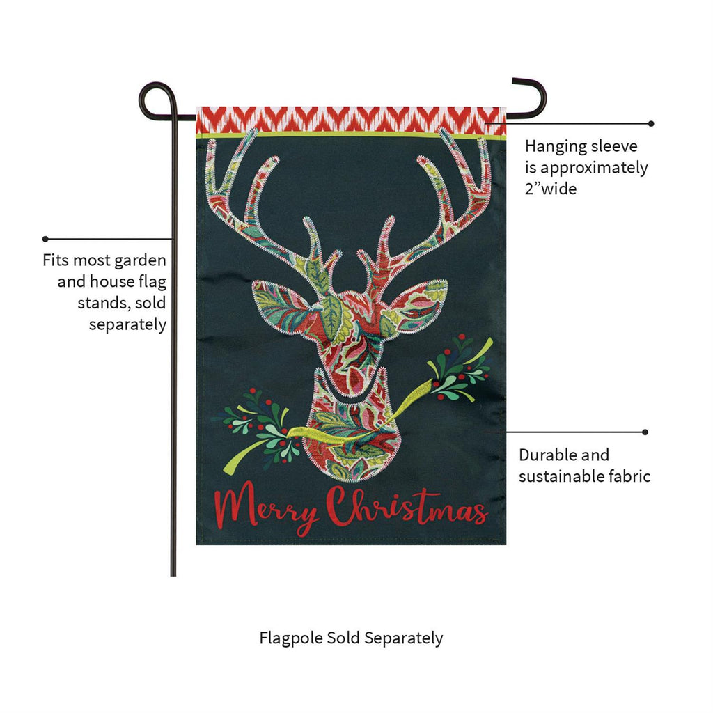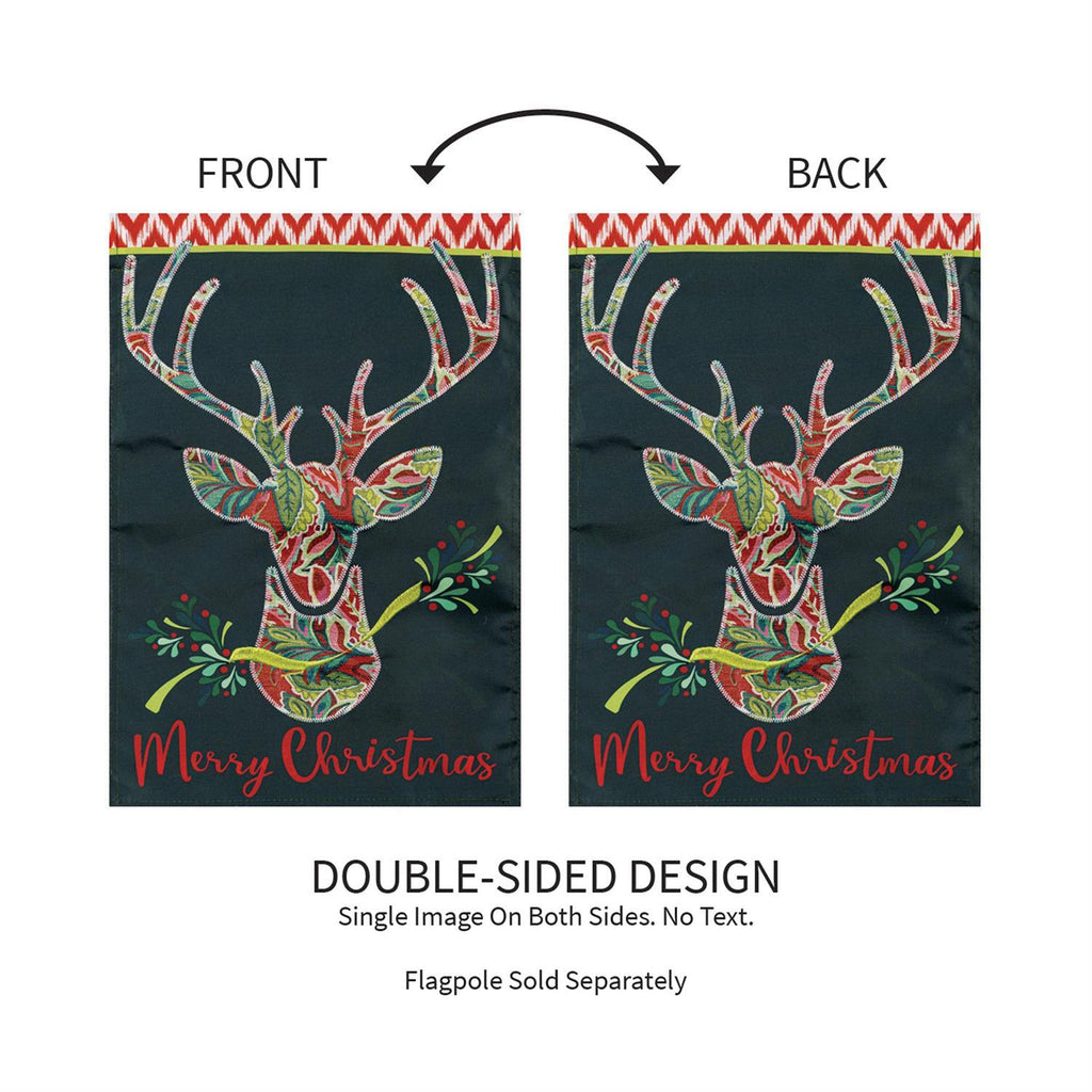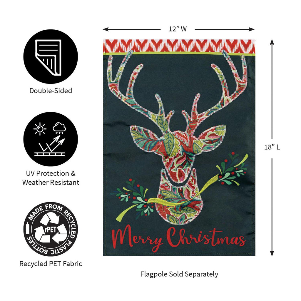 Add a festive touch to your outdoor space with this Patterned Reindeer Applique Garden Flag. Measuring 18 inches in length and 12.5 inches in width, this charming flag features a beautifully detailed reindeer design, complete with vibrant holiday colors and intricate applique work. Perfect for celebrating the Christmas season, its durable construction ensures it withstands winter weather, making it an ideal addition to your garden or entryway. The cheerful "Merry Christmas" greeting at the bottom completes the look, welcoming guests with warmth and holiday spirit.