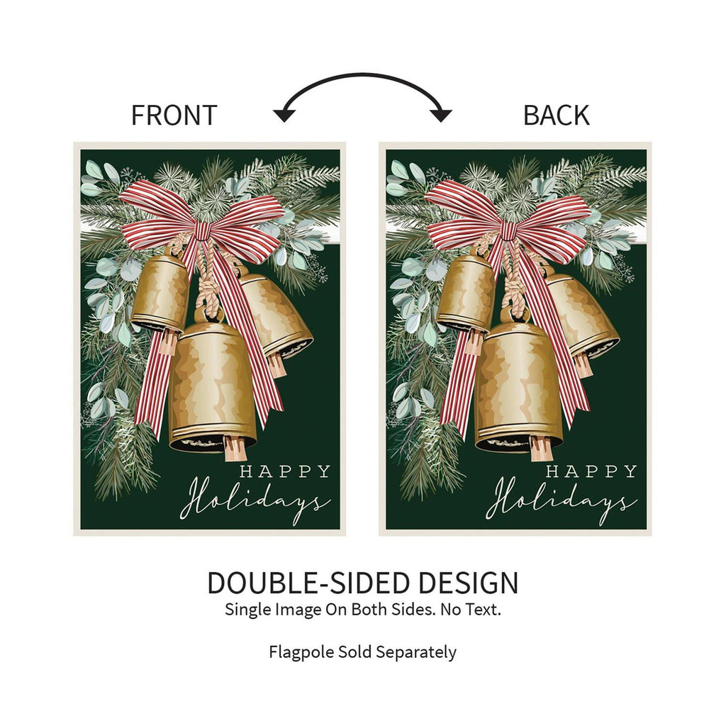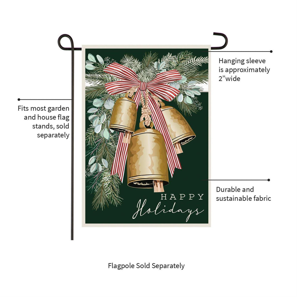 Enhance your holiday décor with this charming Golden Bells Applique Garden Flag. Measuring 18.0 by 12.5 inches, this flag features intricate golden bells adorned with a festive red and white striped bow. The lush greenery in the background adds a touch of nature, making it perfect for the winter season. Crafted with high-quality materials, this durable flag is designed to withstand the elements while adding a welcoming touch to your garden or entryway. Celebrate the holidays with a decorative piece that spreads cheer and warmth.