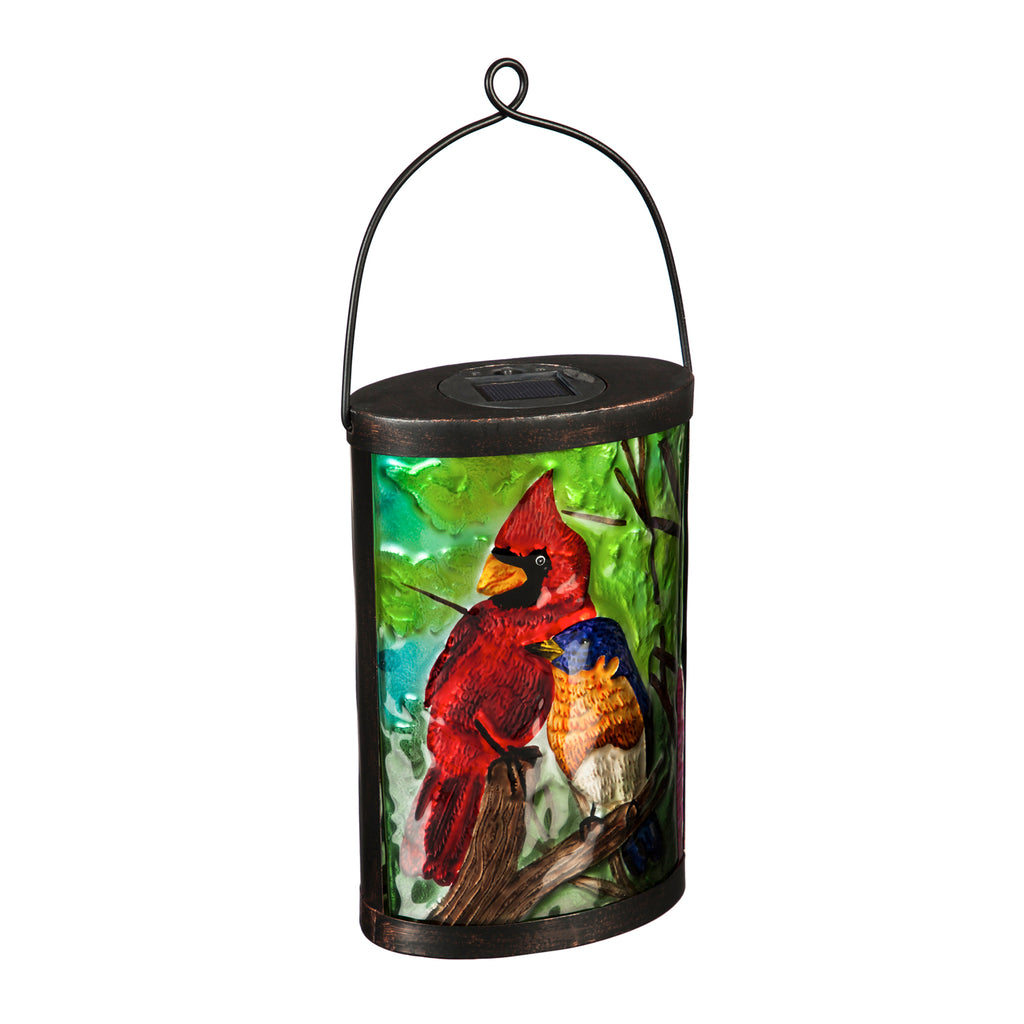 Light up your garden at night with this colorful solar lantern. With a unique blown glass front, this lantern features a painted decal design that glows from the internal light. The lantern housing is constructed from weather-resistant metal and features