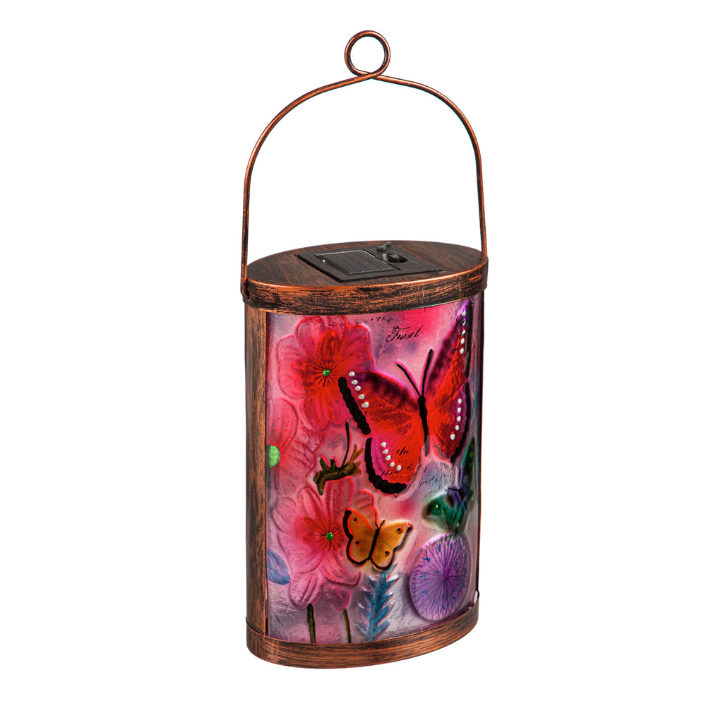 Symbolizing renewal and hope, butterflies make a charming accent. Vibrant butterflies fly over colorful flowers on this handpainted light. Embossed details allow the design to stand out, and at night any garden will be transformed into an oasis with added