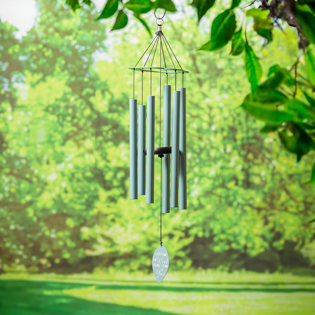 This elegantly crafted wind chime features laser etching with the heartfelt message, 'Every Time the Wind Blows I think of You', adding a personal touch to your outdoor space.