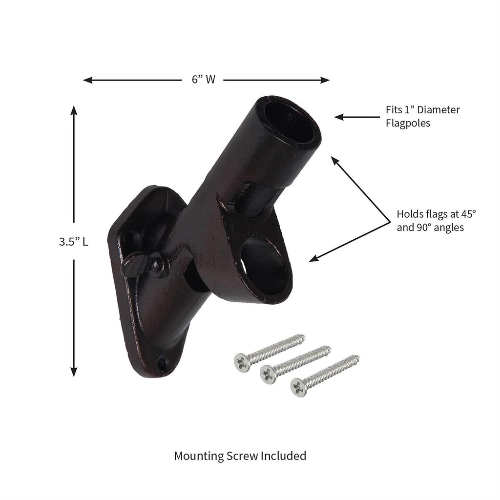 Easy to install, you can fly your flag wherever you'd like with the help of this adjustable pole bracket. Crafted from cast iron with a sleek black look, the two-position bracket, formed by casting, can be used as a wall mount or pole for house and estate flags. Choose between two different positions: 45-degree angle or 90-degree angle. Mounting screws are included. The hardware is powder-coated with a weather-resistant finish to ensure long-lasting use.