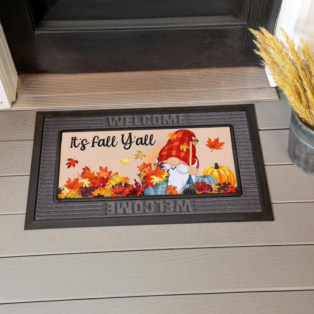 Welcome fall with the charming Raking Gnome Sassafras Switch Mat, featuring a whimsical gnome surrounded by vibrant autumn leaves and pumpkins.