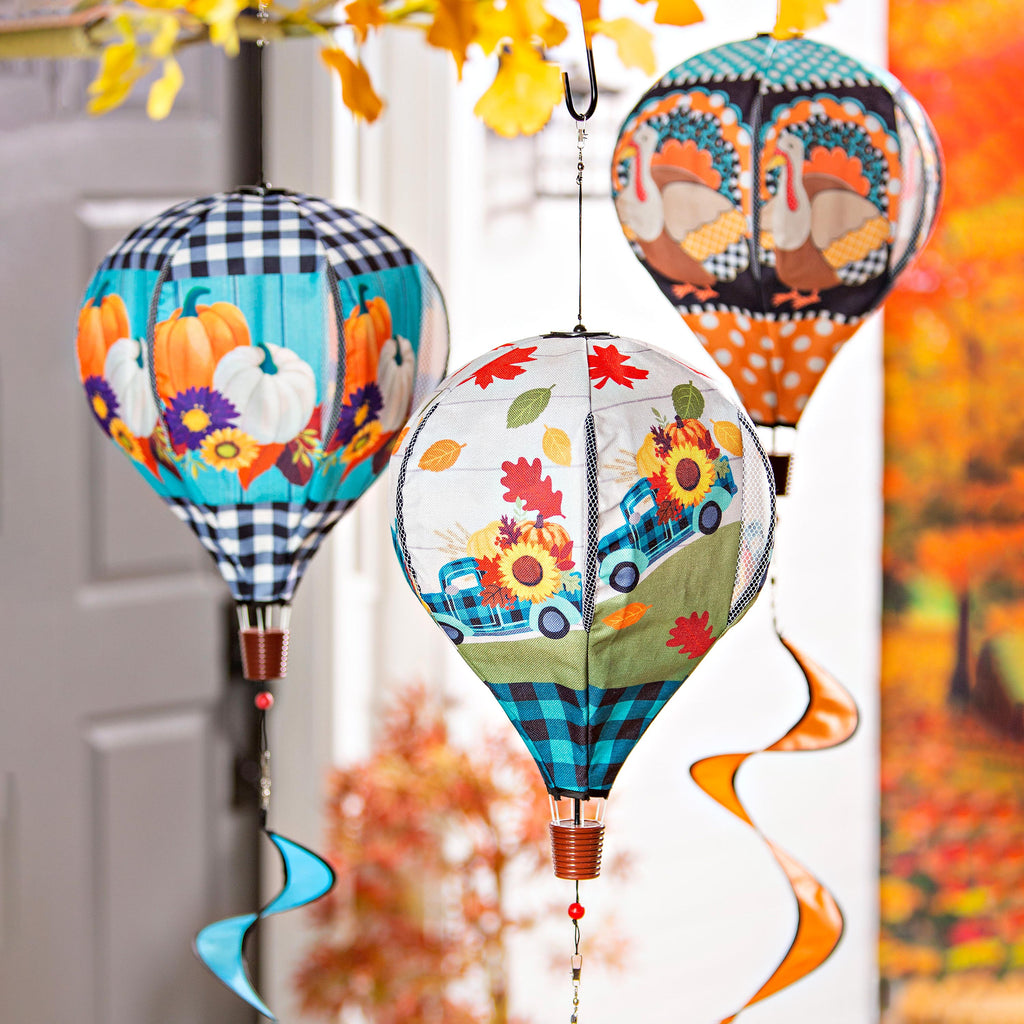 The Fall Plaid Truck Animated Burlap Balloon Spinner brings a festive touch to your outdoor decor with its vibrant colors and dynamic spinning motion.