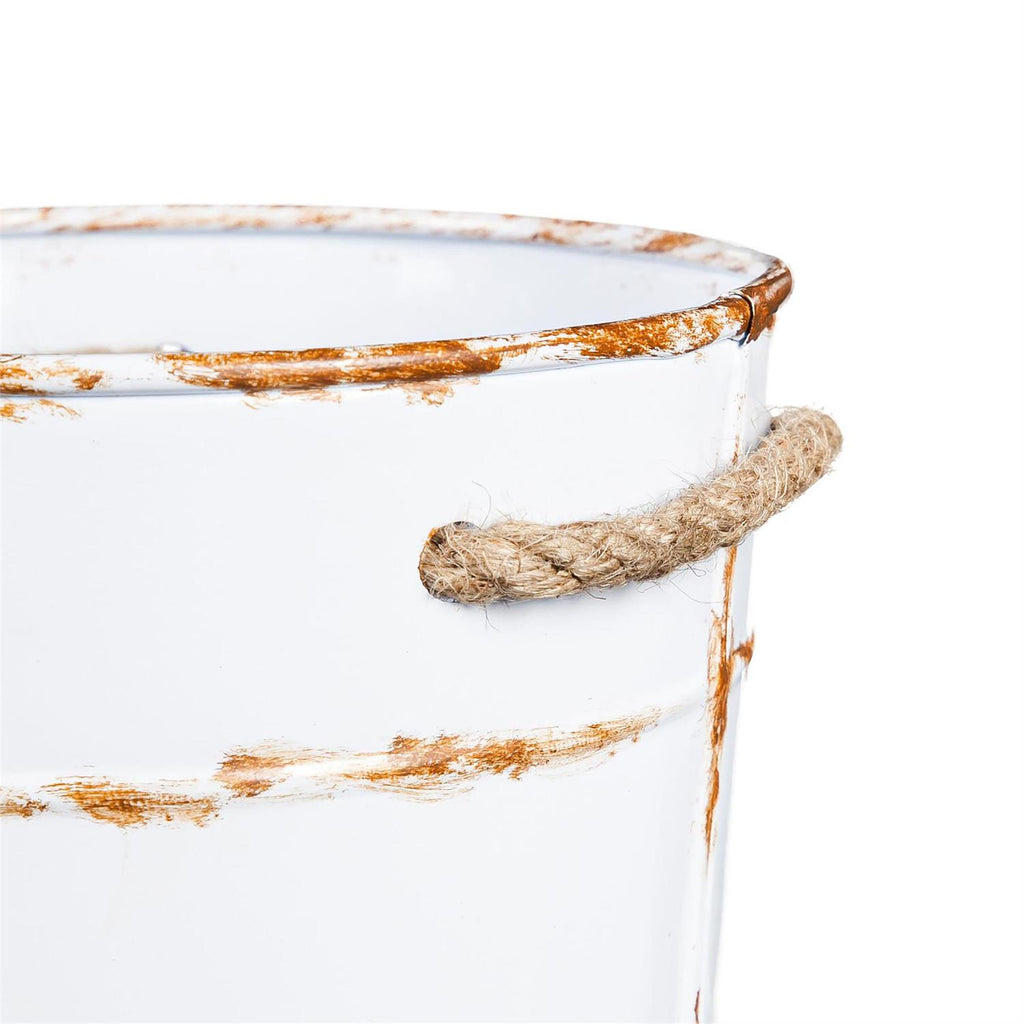 Bring a rustic twist to holiday décor this season with this set of 3 French Buckets. The tall and slender buckets are finished in white with rusted lining for a vintage feel that adds to the shabby-chic look of these buckets. With a jute rope handle detail, each bucket has a different colored tag that says "Merry," "Jingle," and "Holly" for an extra festive touch. Fill the buckets with a tree, plants, kindling wood, or other knick-knacks. The durable iron material is weather-resistant and colorfast to ensure these designs are indoor and outdoor safe. Nest the buckets between seasonal use for easy storage.