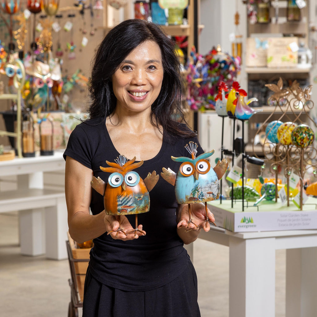 The Garden of Wonder Metal Mini Owls Statue brings a touch of whimsy to any outdoor space with its charming design and vibrant colors. Perfect for adding character to your garden, this statue stands 8 inches tall and is crafted from durable metal.