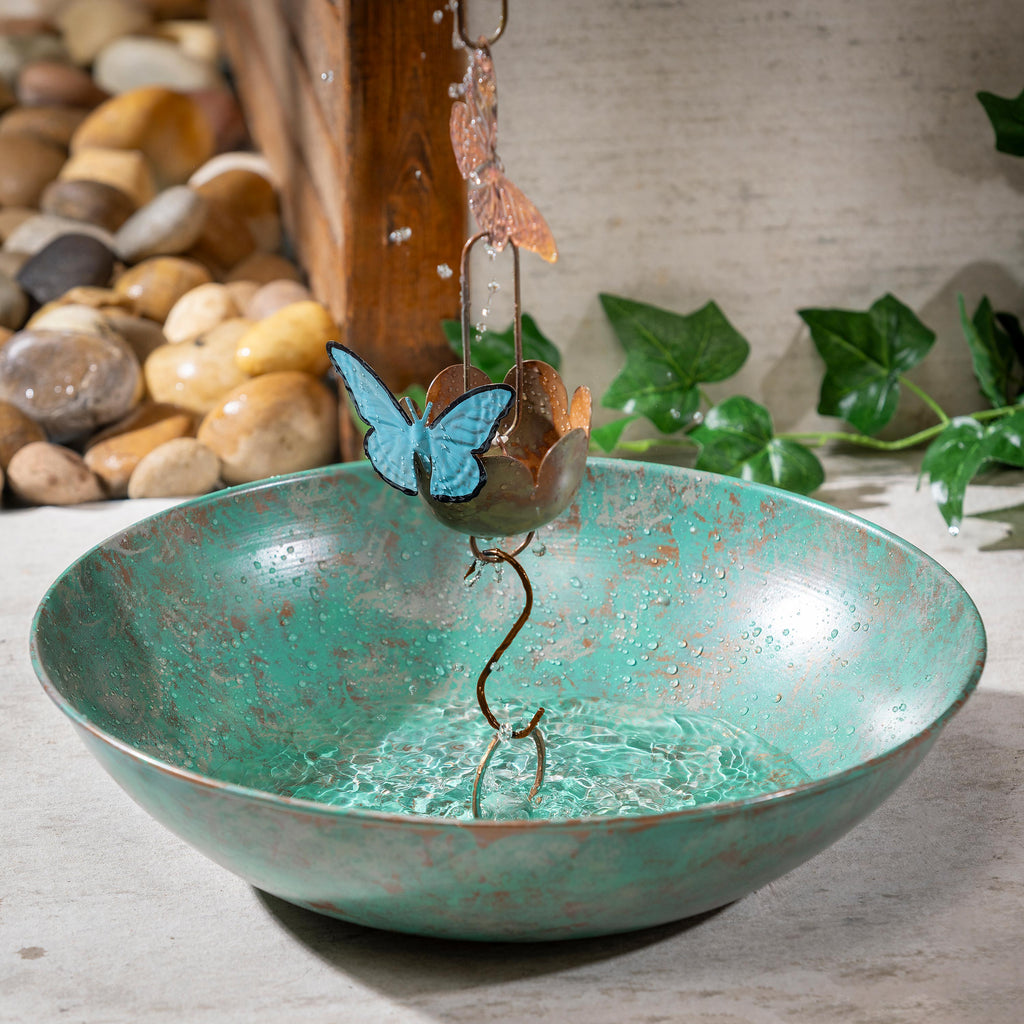 Enhance your garden with the Green Verdigris Rain Chain Basin, designed to elegantly collect rainwater with its rustic charm.