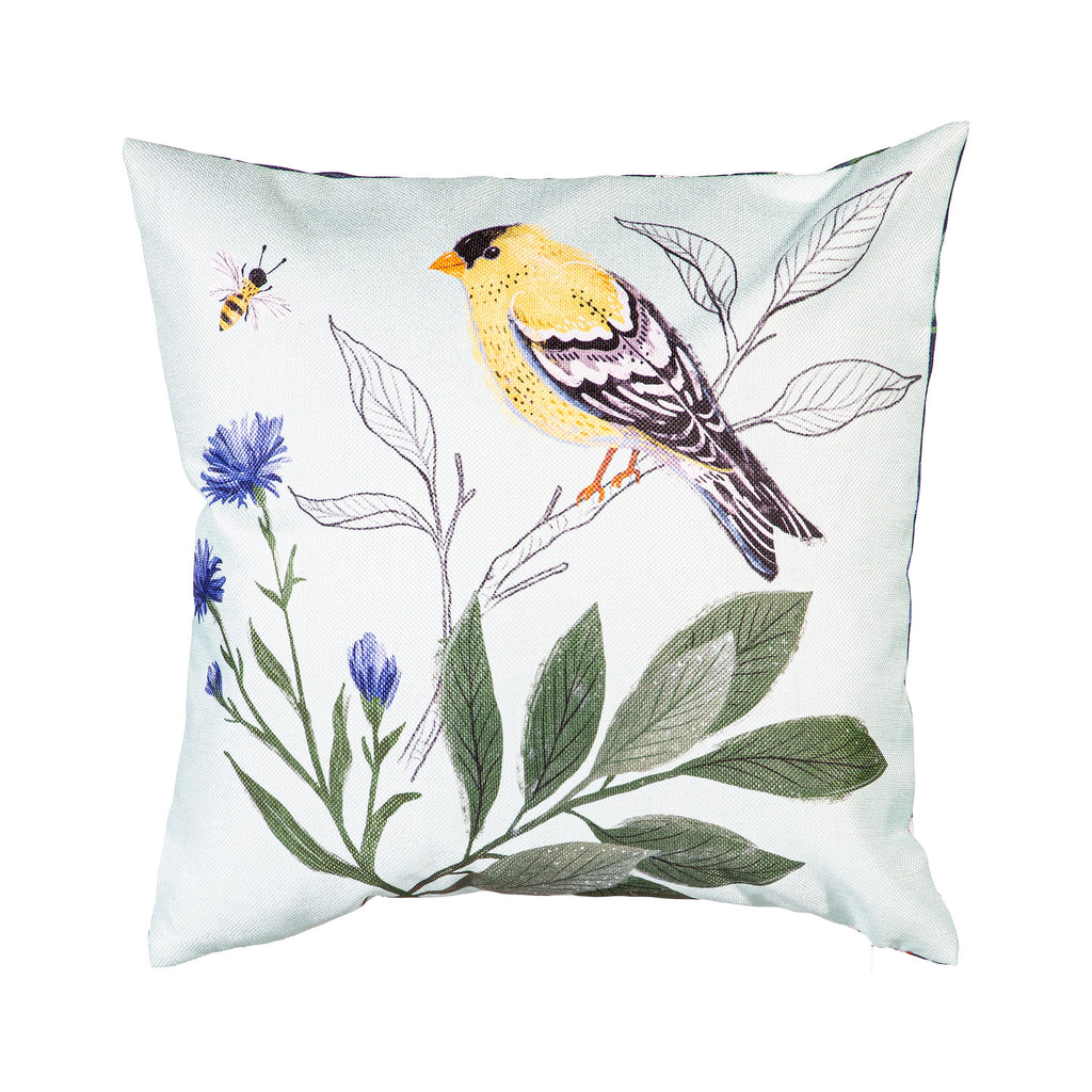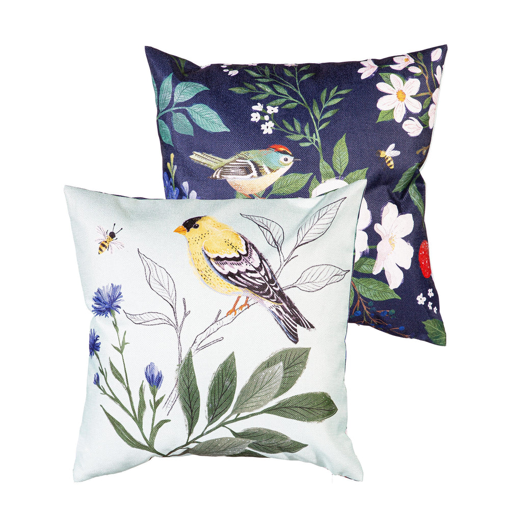 Elevate your spring decor with the Greenhouse Retreat 18" Interchangeable Pillow Cover, featuring vibrant bird and floral designs perfect for outdoor settings.