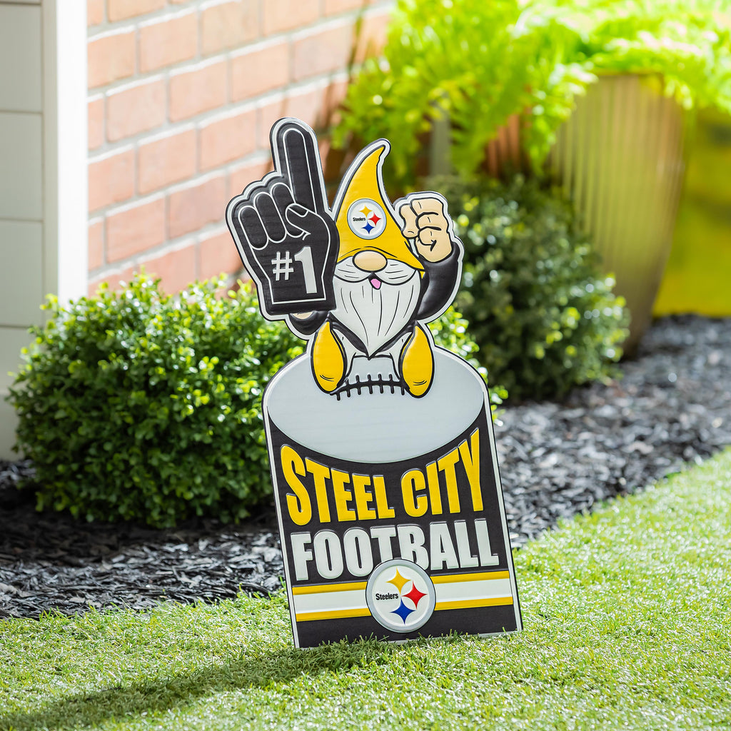 Celebrate your love for the Pittsburgh Steelers with this vibrant gnome metal sign, perfect for adding a playful touch to your garden decor.