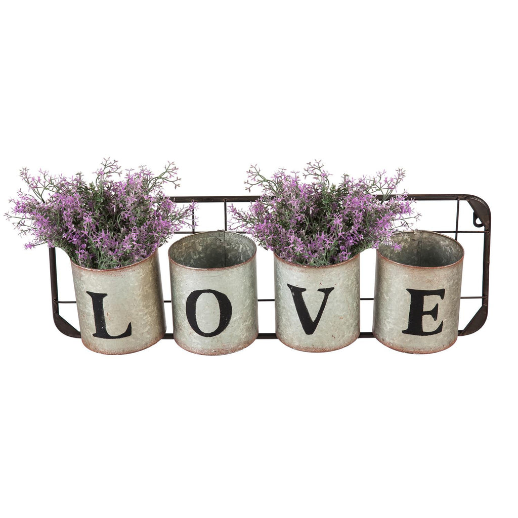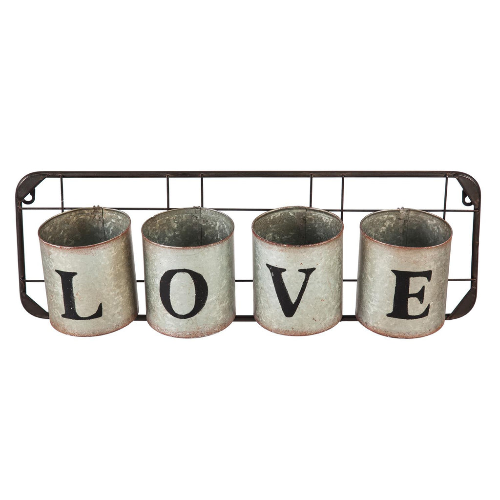 Give your plants a loving touch with these Galvanized Metal Wall Pockets. This rustic design includes four galvanized metal pockets that read "LOVE" for a heart-warming appeal. The wall décor piece is perfect for sprucing up any decorative space and elevating plant displays. The functional and stylish décor is ideal for showcasing small flowers and plants or holding other knick-knacks for extra storage and organization. Keyhole anchors on the back allow for easy wall hanging. This delightful decoration is perfect for kitchens, living rooms, hallways, and more.