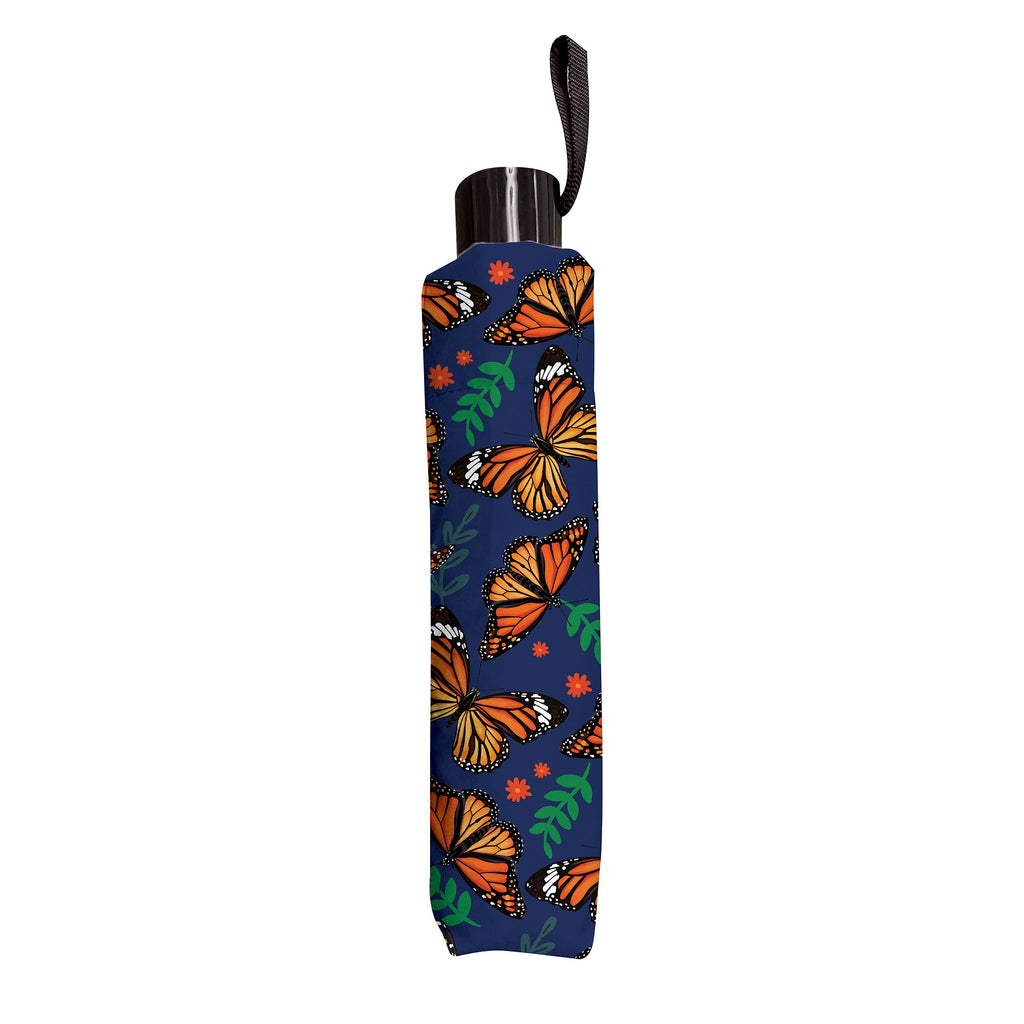 The Mariposa Melody Butterfly Scatter Compact Manual Umbrella is a stylish and functional accessory perfect for fall weather. It features a vibrant butterfly design on a compact frame, making it easy to carry.