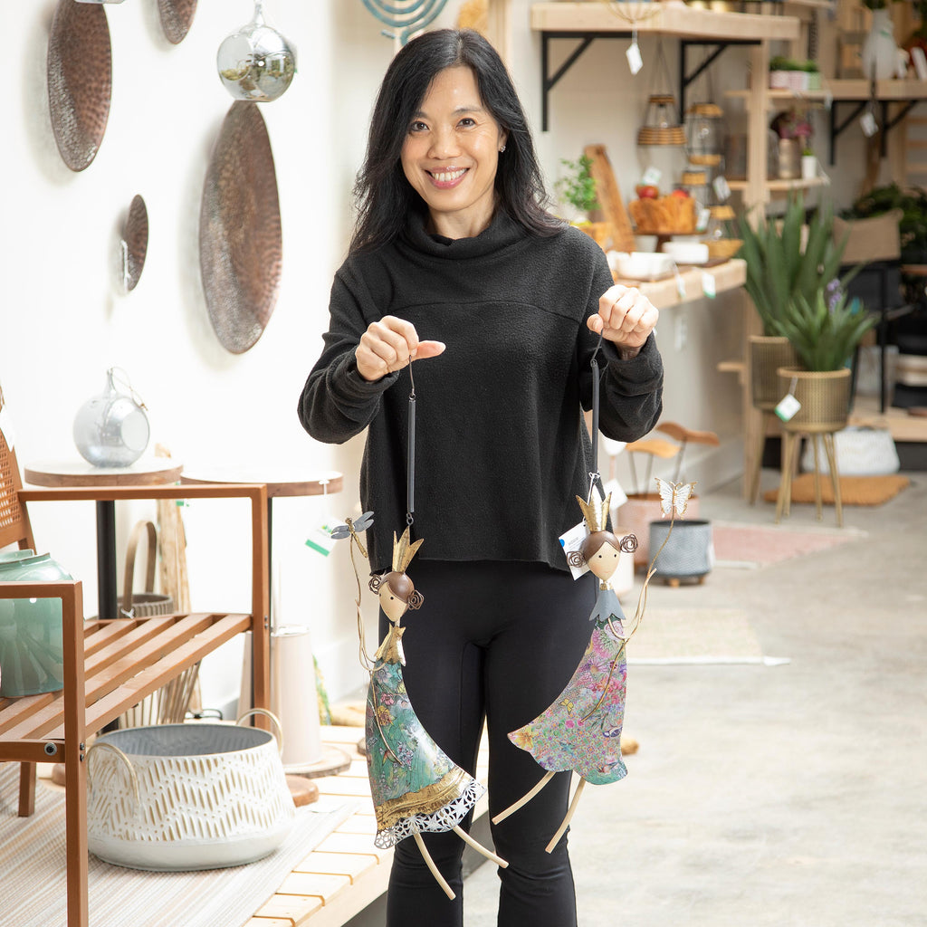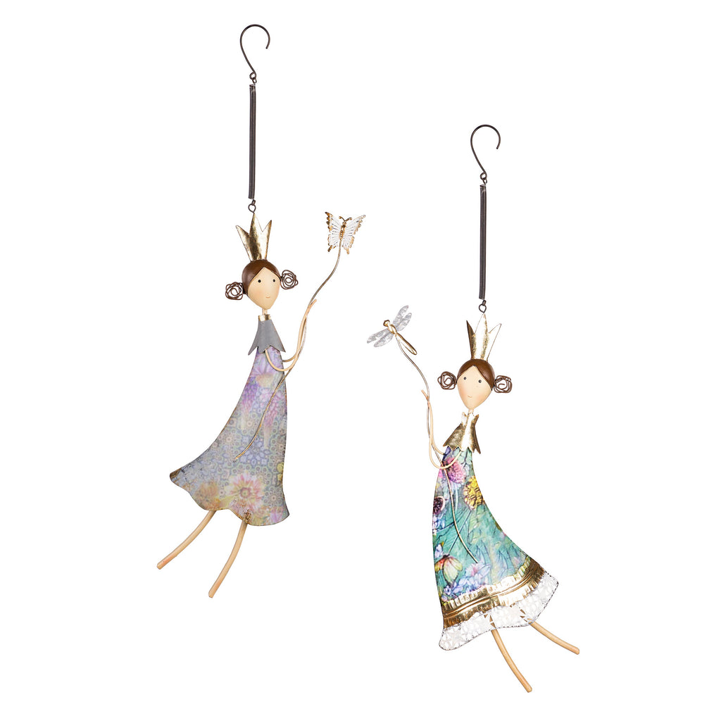 Enhance your garden with this enchanting set of two hand-painted metal fairy decorations, each adorned with delicate bug details and designed to sway gently in the breeze.