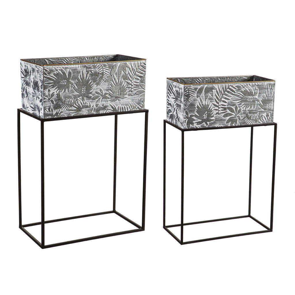 Enhance your home or garden with this set of two Metallic Embossed Floral Planters. These striking planters feature a detailed floral design embossed on a metallic surface, adding a touch of elegance to any space. Standing tall with a sleek black metal stand, they are perfect for showcasing your favorite indoor or outdoor plants. Their generous dimensions provide ample room for various plants, making them a versatile addition to your décor. Ideal for modern or contemporary settings, these planters effortlessly blend style with functionality.