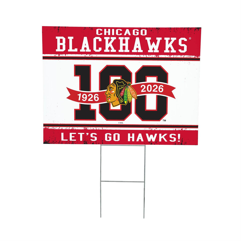 Celebrate the Chicago Blackhawks' 100th anniversary with this vibrant Coroplast yard sign. Measuring 24 by 18 inches, this durable sign is perfect for showing your team spirit in your garden or on your lawn. The high-quality print features the iconic Blackhawks logo and bold anniversary dates, making it a standout piece for any fan. Lightweight and weather-resistant, this sign will withstand the elements while maintaining its vivid colors. Whether you're hosting a game day party or just want to display your loyalty, this sign is an excellent choice.
