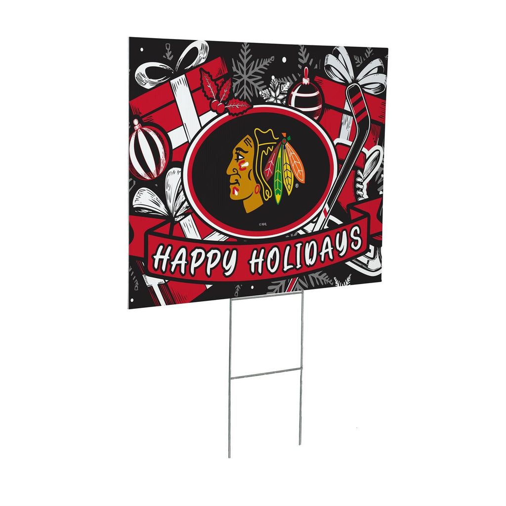 Celebrate the holiday season with this Chicago Blackhawks Yard Sign, a perfect addition to any fan's garden. Measuring 24 by 18 inches, this durable sign is designed to withstand winter weather while proudly displaying your team spirit. The vibrant colors and festive design featuring holiday elements make it an eye-catching statement piece for your yard. Easy to install and remove, it adds a touch of cheer and team pride to your outdoor décor. Ideal for holiday parties or simply showing off your Blackhawks allegiance all season long.