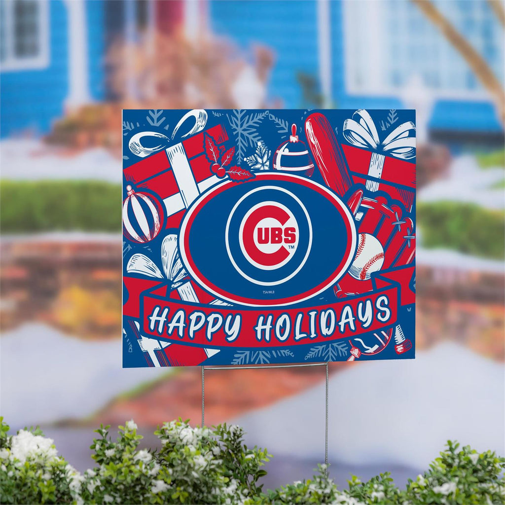 Celebrate the holiday season with this vibrant Chicago Cubs yard sign, perfect for any fan's garden or yard. Featuring festive graphics and the iconic Cubs logo, this sign adds team spirit to your holiday décor. Made from durable materials, it withstands winter weather, ensuring your yard looks great all season long. Its standout colors and design make it a must-have for showing off your Cubs pride while spreading holiday cheer. Easy to install with included stakes, this sign is a great addition to any Cubs fan's outdoor display.