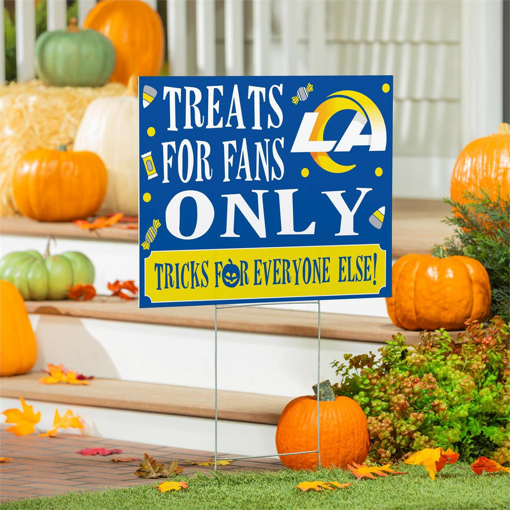 Celebrate Halloween with team spirit using the Los Angeles Rams Yard Sign. This vibrant garden sign is perfect for Rams fans who want to show their team pride while welcoming trick-or-treaters. Featuring bold blue and yellow colors, the sign reads 'Treats for Fans Only' and is adorned with fun Halloween imagery. Made from durable materials, this sign is designed to withstand the elements, ensuring it remains a festive addition to your outdoor décor all season long. Its 24-inch by 18-inch size makes it a noticeable yet tasteful display.