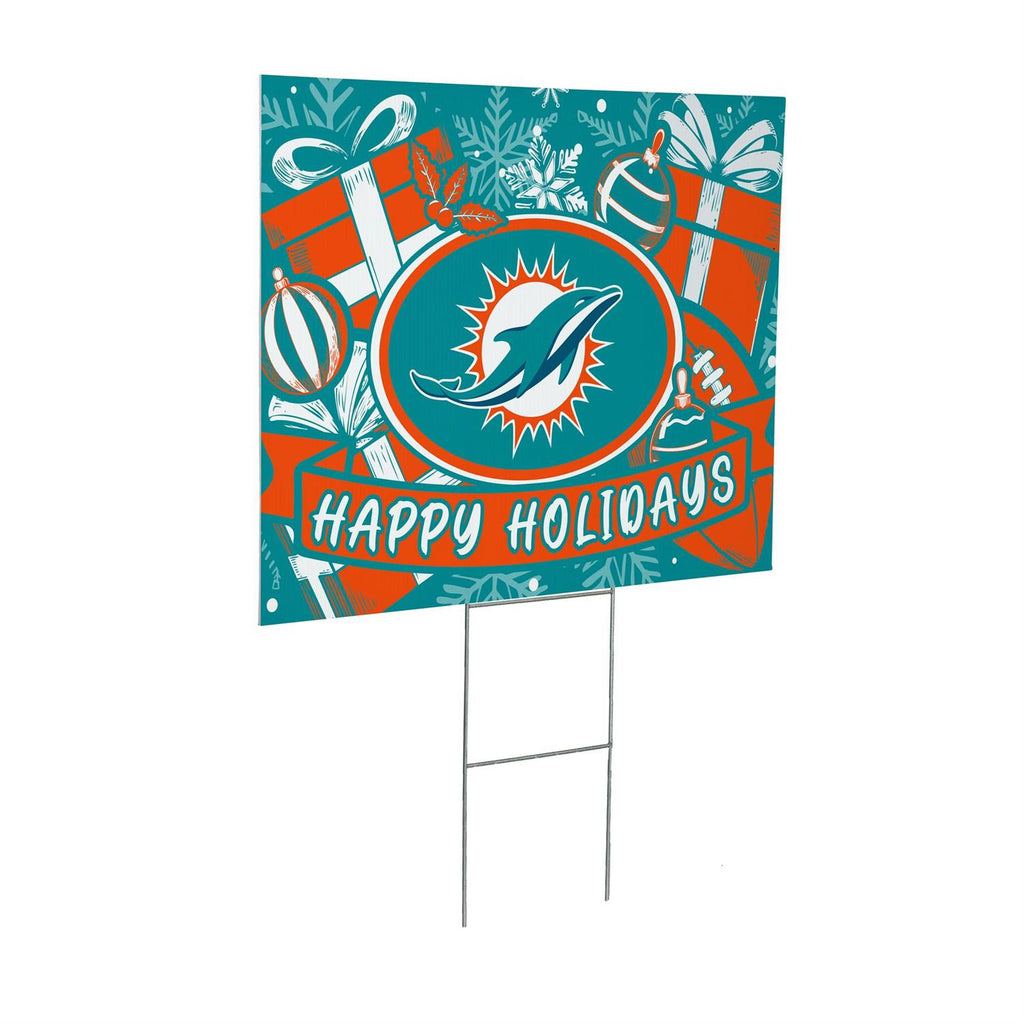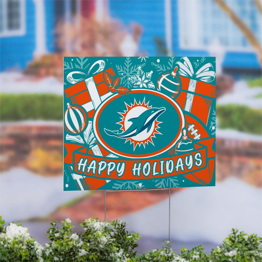 Celebrate the festive season while showing your team spirit with this Miami Dolphins yard sign. Perfect for any Dolphins fan, this holiday-themed sign features vibrant team colors and a cheerful design with ornaments and gifts. Measuring 24 inches in length and 18 inches in width, it’s the ideal size for your garden or front yard. The sturdy construction ensures it withstands winter weather, making it a great addition to your outdoor holiday décor. Easy to set up, this sign is a fun way to spread cheer and show support for your favorite team.