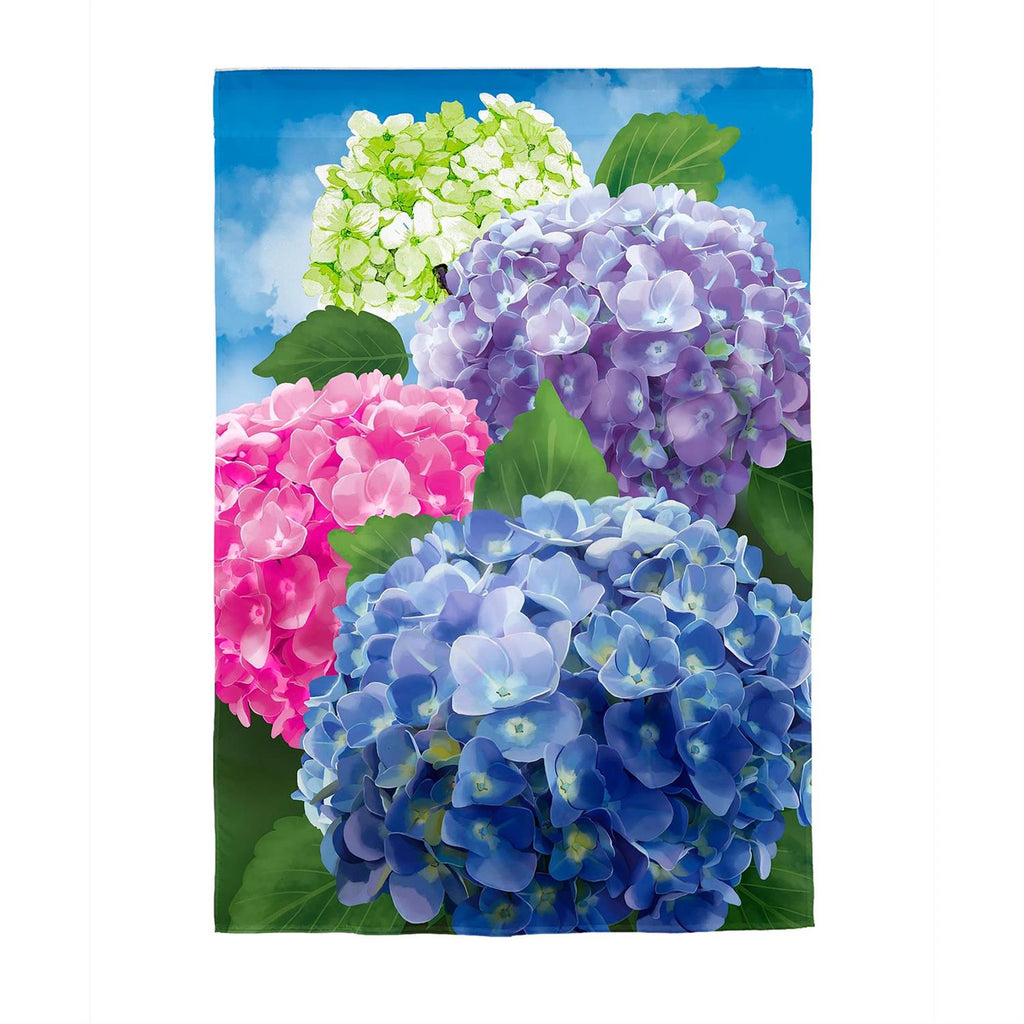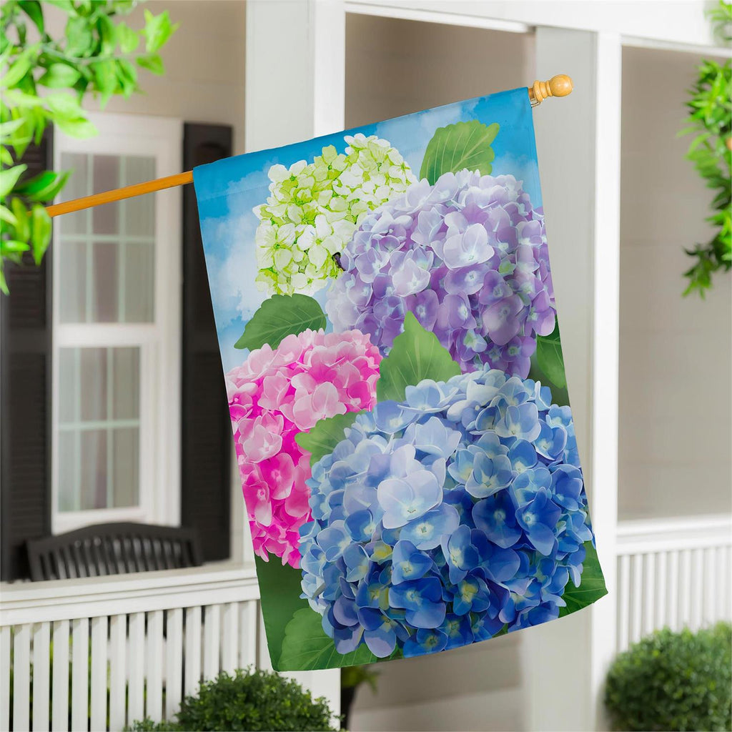 Enhance your home's curb appeal with this vibrant Multicolor Hydrangeas Suede House Flag. Designed to bring a touch of elegance and color to your outdoor space, this flag features a stunning array of hydrangeas in full bloom. Crafted from durable suede, it offers a soft texture and rich color saturation that stands out in any garden or entryway. Measuring 29 inches in width and 43 inches in height, it's the perfect size to make a statement while fitting standard house flag poles. Ideal for spring and summer, this flag adds a welcoming touch to any home.