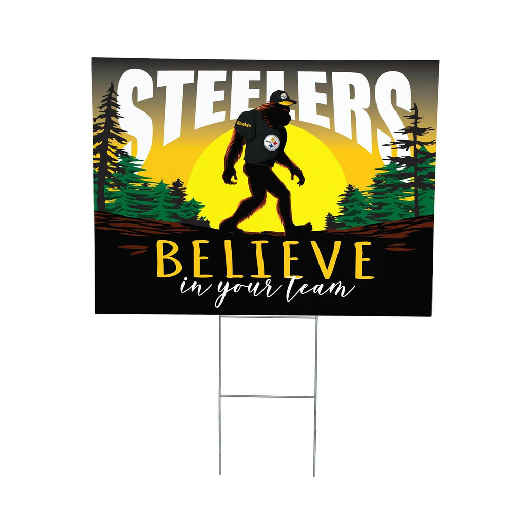 Show your team spirit with this eye-catching Pittsburgh Steelers Yard Sign featuring a fun Bigfoot design. Perfect for any Steelers fan, this garden sign is a unique way to display your loyalty. Measuring 24 inches by 18 inches, it's the ideal size for your front yard or garden. The vivid colors and bold design ensure it stands out, while the durable material withstands outdoor conditions. Easy to install and remove, this sign is a must-have for game days or everyday support.