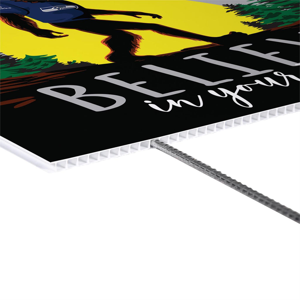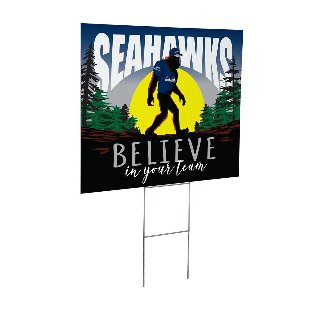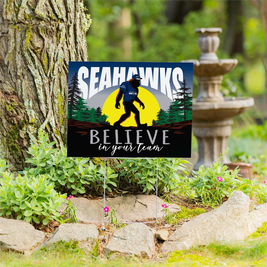 Show off your team spirit with the Seattle Seahawks Yard Sign featuring Bigfoot. Perfect for fans who love a touch of whimsy, this garden sign stands at 24 inches tall and 18 inches wide, making it an eye-catching addition to your outdoor space. With vivid graphics and a bold message to "Believe in Your Team," this sign is designed to withstand the elements while supporting your favorite team. Easy to set up, it's ideal for game days or year-round display. Let Bigfoot help you cheer on the Seahawks in style.